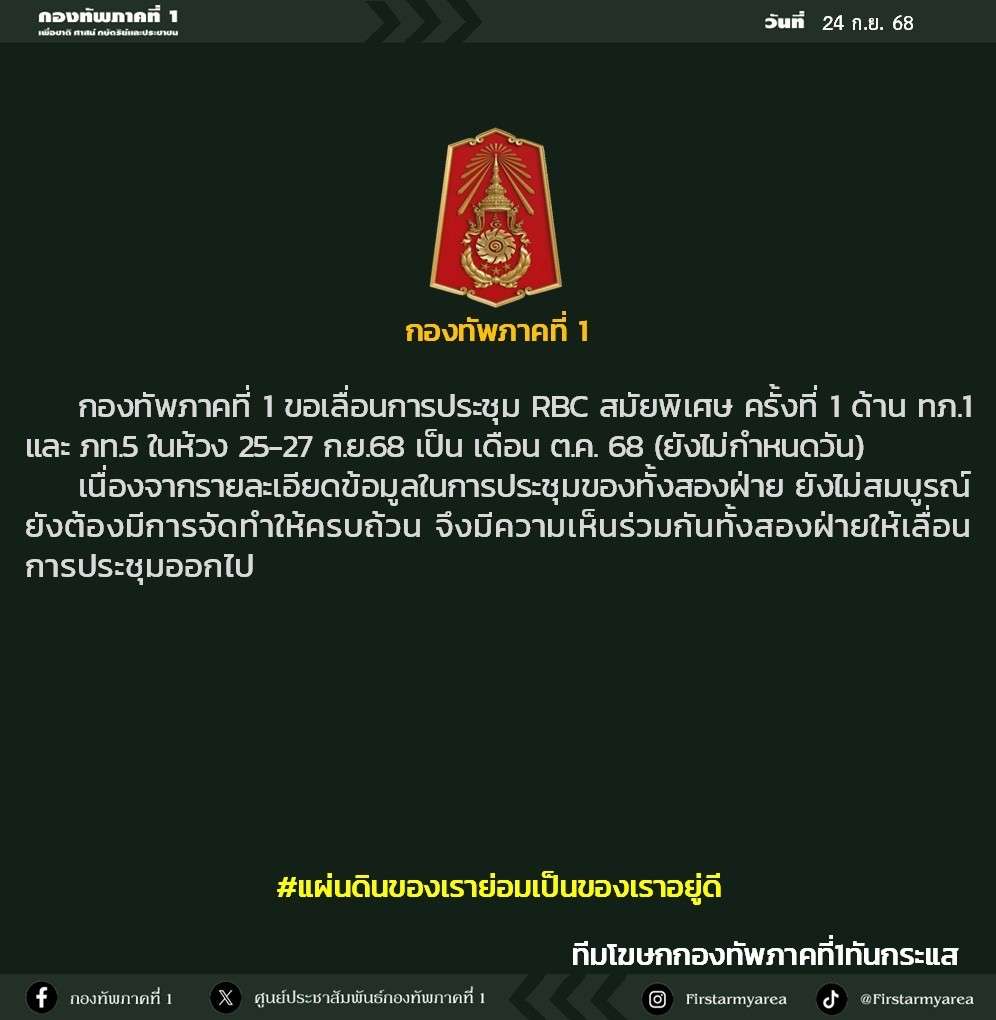 กรุงเทพฯ, วันที่ 25 ก.ย. – ทีมโฆษกกองทัพภาคที่ 1 แจ้งว่ากองทัพภาคที่ 1 ประกาศขอเลื่อนการประชุม RBC สมัยพิเศษ ครั้งที่ 1 ด้าน ทภ.1 และ ภท.5 ในห้วง 25-27 ก.ย.68 เป็น เดือน ต.ค. 68 (ยังไม่กำหนดวัน) เนื่องจากรายละเอียดข้อมูลในการประชุมของทั้งสองฝ่าย ยังไม่สมบูรณ์ ยังต้องมีการจัดทำให้ครบถ้วน จึงมีความเห็นร่วมกันทั้งสองฝ่ายให้เลื่อนการประชุมออกไป