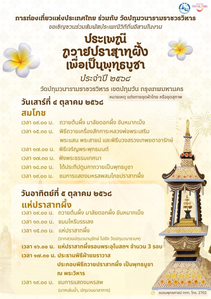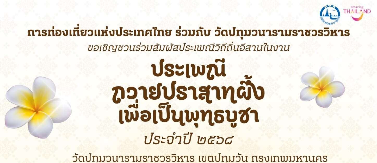 การท่องเที่ยวแห่งประเทศไทย (ททท.) ร่วมกับวัดปทุมวนารามราชวรวิหาร เขตปทุมวัน กรุงเทพฯ เชิญชวนพุทธศาสนิกชนและผู้สนใจร่วมงาน “ประเพณีถวายปราสาทผึ้ง เพื่อเป็นพุทธบูชา ประจำปี 2568” ระหว่างวันที่ 4 – 5 ตุลาคม 2568