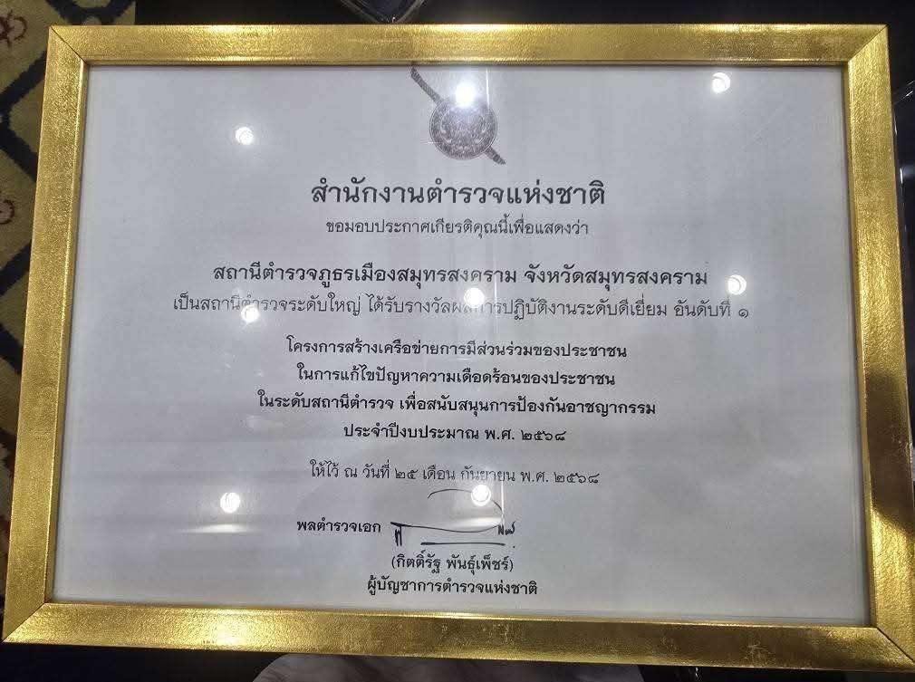 โดยได้รับมอบรางวัลด้วยตนเองจาก พล.ต.อ.กิตติ์รัฐ พันธุ์เพ็ชร์ ผู้บัญชาการตำรวจแห่งชาติ รางวัลนี้ไม่ได้มาเพราะโชคช่วย แต่มาจากความทุ่มเทภายใต้ โครงการ “สร้างเครือข่ายการมีส่วนร่วมของประชาชน ในการแก้ไขปัญหาความเดือดร้อน และสนับสนุนการป้องกันอาชญากรรม” ซึ่งเป็นเครื่องตอกย้ำว่า การทำงานของ สภ.เมืองสมุทรสงคราม เน้นการสร้างความเชื่อมั่น และดึงพลังของพี่น้องประชาชนเข้ามาเป็นส่วนหนึ่งในการป้องกันอาชญากรรมอย่างแท้จริง!