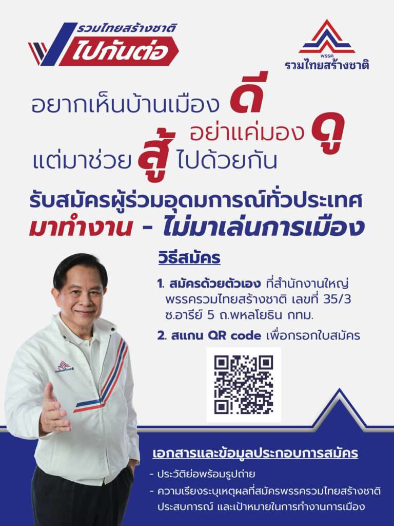 จึงขอเชิญชวนทุกคนที่มีแนวคิด มีความตั้งใจเหมือนตน และพรรครวมไทยสร้างชาติ มาร่วมทำงานด้วยกันโดยสามารถสมัครได้ 2 วิธี ได้แก่ วิธีที่ 1 สมัครด้วยตนเองที่ทำการพรรค เลขที่ 35/3 ซอยอารีย์ 5 ถนนพหลโยธิน กรุงเทพฯ และวิธีที่ 2 คือ กรอกใบสมัครที่ลิงก์นี้ https://forms.gle/jwYGG9zNnGedtiqb7