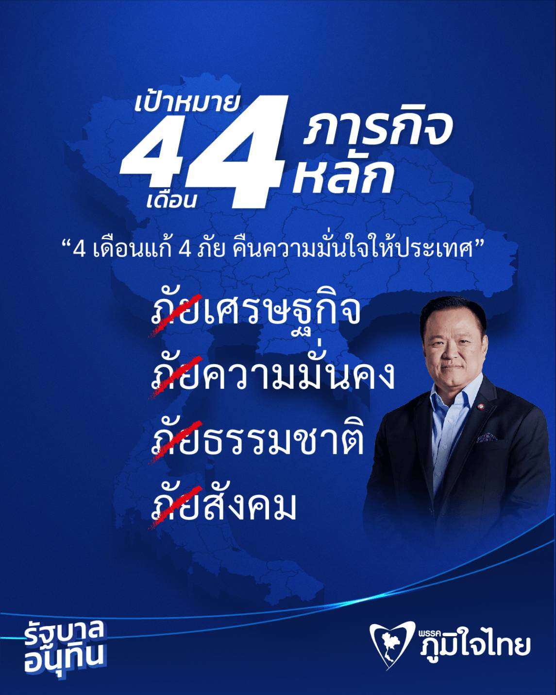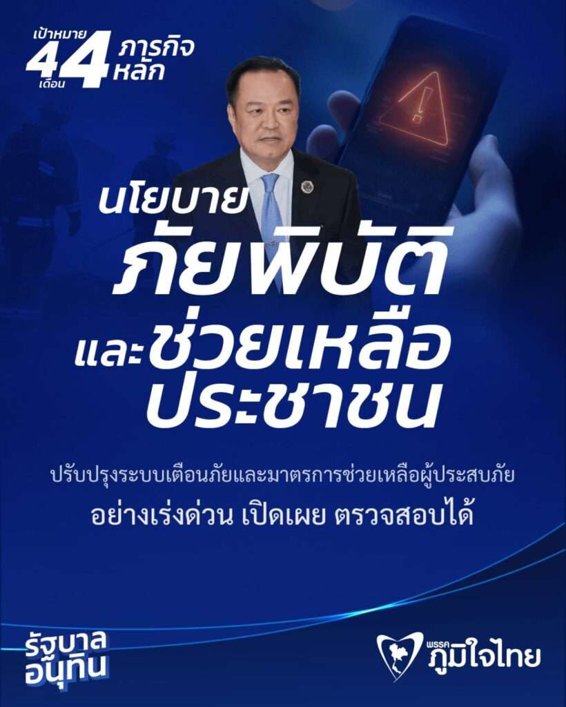 วันที่ 28 ก.ย.2568 นางสาวแนน บุณย์ธิดา สมชัย โฆษกพรรคภูมิใจไทย เปิดเผยว่า เพจเฟซบุ๊กพรรคภูมิใจไทย ได้ลงภาพสรุปเนื้อหานโยบายรัฐบาล นายอนุทิน ชาญวีรกูล ที่จะมีการอภิปรายในรัฐสภาวันที่ 29 – 30 กันยายน 2568 โดยนำ นโยบายด้านต่าง ๆ มาสรุป ให้กระชับได้ใจความ เป้าหมาย “4 เดือน 4 ภารกิจหลัก” 4 เดือนแก้ 4 ภัย คืนความมั่นใจให้ประเทศ ภัยเศรษฐกิจ ภัยความมั่นคง ภัยธรรมชาติ ภัยสังคม