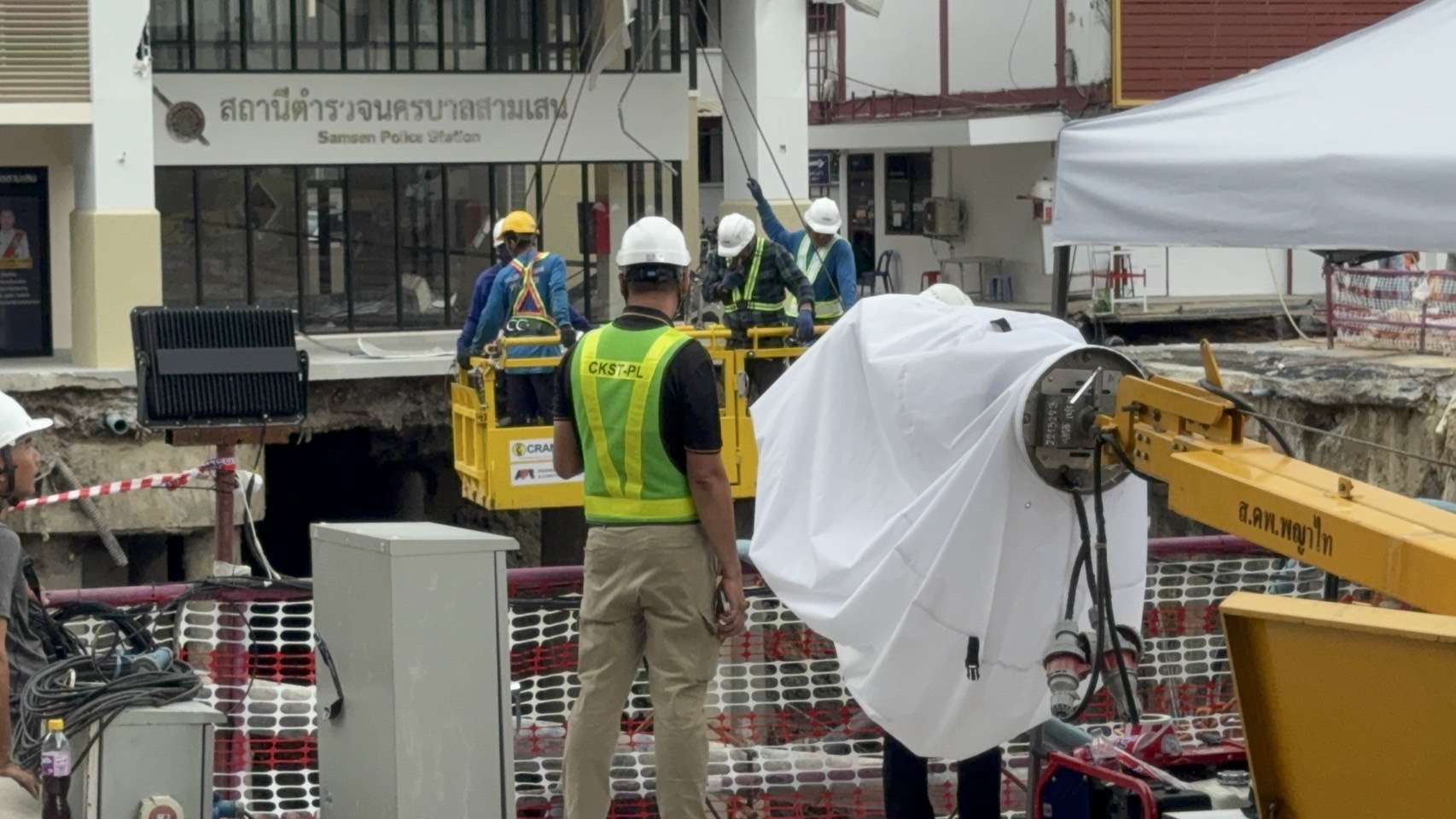 นอกจากนี้ วันนี้จะมีการใช้เครนขนาดใหญ่ เพื่อมายกวัสดุสิ่งของที่อยู่ภายในหลุมขึ้นมา เช่น เสาไฟฟ้า หม้อแปลงไฟฟ้า ท่อน้ำประปา และเศษวัสดุอื่น ๆ และเมื่อปูนทุกจุดเซ็ตตัวแล้ว ก็จะนำดินและหินคลุกมาถม เพื่อเร่งคืนพื้นผิวถนนให้ประชาชนได้กลับมาใช้การได้ตามปกติ รวมถึงให้เจ้าหน้าที่ลงกระเช้า เพื่อไปตัดสายสื่อสารด้านล่าง ทั้งสายไฟ สายสื่อสารต่าง ๆ แต่หากเป็นวัสดุชิ้นใหญ่ก็จะใช้รถเครนในการเคลื่อนย้ายยกออกมา คาดว่า วันอังคารจะเริ่มเททราย เพื่อถมพื้นที่ภายในหลุม และบริเวณใต้อาคาร สน.สามเสนด้วย