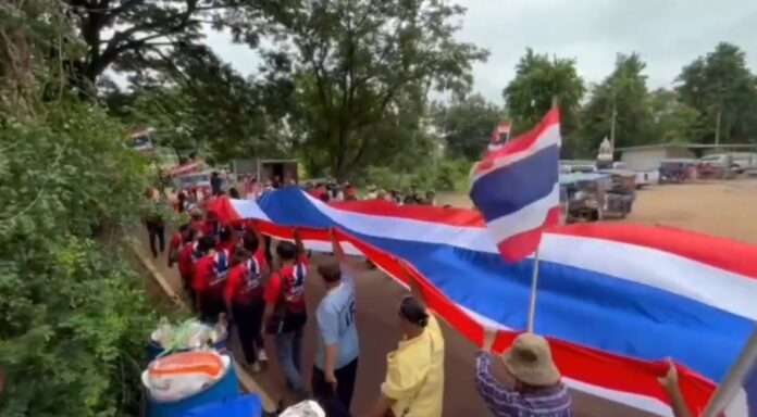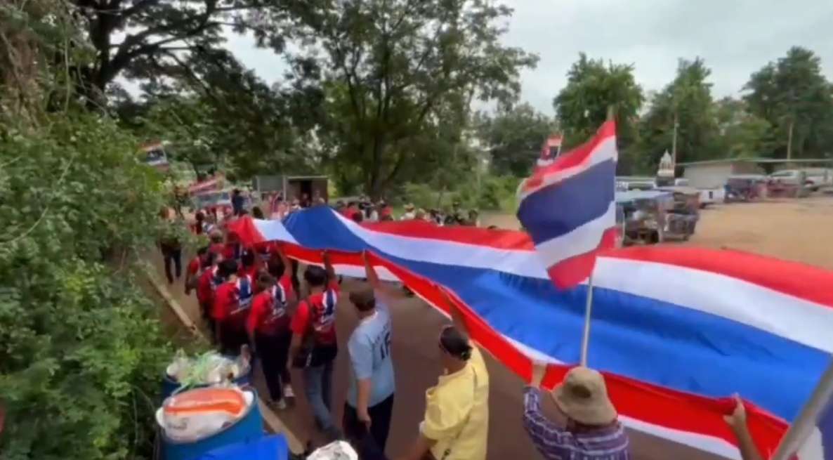 ชาวบ้านอำเภอแกลงรวมตัวเดินขบวนถือธงชาติ ร้องเพลงชาติ–สรรเสริญพระบารมี กึกก้องทั่วบ้านหนองจาน จ.สระแก้ว สะท้อนพลังสามัคคีและกำลังใจส่งถึงทหารแนวหน้า