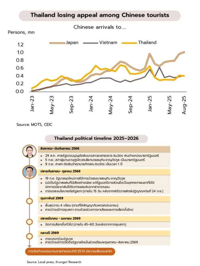 หรือคิดเป็นเพียงประมาณ 40% ของระดับก่อนการแพร่ระบาดในปี 2562 ปัจจัยดังกล่าวสะท้อนถึงความกังวลด้านความปลอดภัยและการเปลี่ยนแปลงพฤติกรรมการเดินทางของนักท่องเที่ยวจีนที่หันไปเลือกจุดหมายปลายทางอื่นเพิ่มขึ้น ไม่เพียงแต่ญี่ปุ่นเท่านั้นหากยังรวมถึงประเทศในอาเซียน โดยเฉพาะเวียดนามซึ่งในช่วง 8 เดือนแรกของปีนี้สามารถดึงดูดนักท่องเที่ยวจีนได้ถึง 3.5 ล้านคน สูงกว่าไทยอย่างมีนัยสำคัญ รวมถึงมาเลเซียที่ได้รับความนิยมมากขึ้นเช่นกัน สถานการณ์ดังกล่าวนี้สะท้อนว่าไทยกำลังสูญเสียความสามารถในการแข่งขันในตลาดจีนซึ่งเคยเป็นตลาดหลักของการท่องเที่ยวไทย และตอกย้ำว่าแนวโน้มการฟื้นตัวของภาคท่องเที่ยวในช่วงที่เหลือของปี 2568 ยังคงเผชิญความท้าทายสูง หากไม่มีมาตรการเชิงรุกเพื่อแก้ไขปัญหาดังกล่าวข้างต้น โดยเฉพาะภาพลักษณ์ด้านความปลอดภัย อาจทำให้บทบาทของการท่องเที่ยวในฐานะที่เคยเป็นแรงขับเคลื่อนหลักของเศรษฐกิจไทยลดลงในระยะถัดไป
