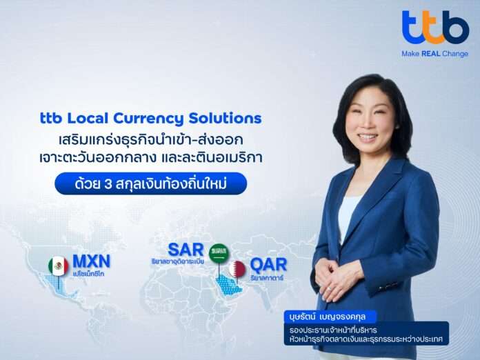 ทีทีบีชวนผู้ประกอบการไทยบริหารความเสี่ยงค่าเงิน ผ่าน ttb Local Currency Solutions ลดการพึ่งพาสกุลหลักอย่างดอลลาร์สหรัฐที่มีความผันผวนสูง ด้วยบริการจัดการธุรกรรมผ่านสกุลเงินท้องถิ่นครอบคลุมกว่า 18 สกุลเงินท้องถิ่นหลักทั่วโลก ล่าสุดเปิด 3 สกุลเงินใหม่ ตอบโจทย์ขยายโอกาสทางการค้าไปยังตลาด ที่มีศักยภาพสูง ได้แก่ ตะวันออกกลาง และละตินอเมริกา