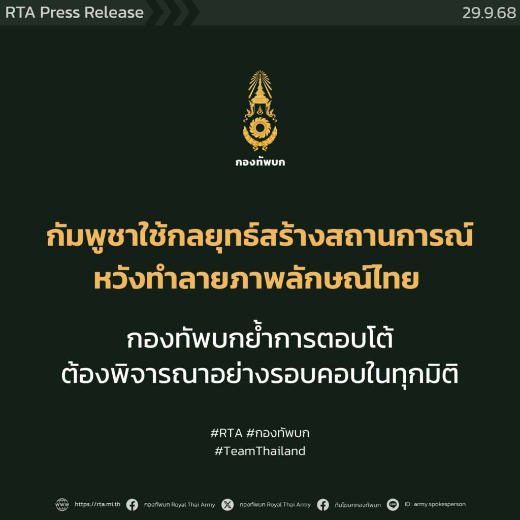 การสร้างสถานการณ์เช่นนี้มีเป้าหมายเพื่อขยายผลไปยังเวทีสากล ทำลายภาพลักษณ์ของฝ่ายไทย ดังนั้น กองทัพบกจึงต้องระมัดระวังเป็นพิเศษในการตอบโต้ทางทหาร เพื่อไม่ให้ตกเป็นเครื่องมือของการบิดเบือนข้อเท็จจริง ขณะเดียวกัน เราก็ยึดมั่นว่าการปกป้องอธิปไตยของชาติไม่สามารถอาศัยเพียงกำลังทางทหารเท่านั้น แต่จำเป็นต้องบูรณาการทั้งมาตรการด้านการเมือง การทูต และการสื่อสารที่ชัดเจนและเป็นระบบ ทั้งต่อประชาชนภายในประเทศและต่อประชาคมระหว่างประเทศ