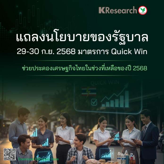 กรุงเทพฯ, วันที่ 1 ต.ค. – หลังจากที่รัฐบาลชุดใหม่ภายใต้การนำของนายกรัฐมนตรีอนุทิน ชาญวีรกูล ได้แถลงนโยบายต่อรัฐสภาเมื่อวันที่ 29-30 ก.ย. 2568 ศูนย์วิจัยกสิกรไทย คาดการณ์ว่านโยบายเศรษฐกิจระยะสั้น (Quick Win) ของรัฐบาลน่าจะช่วยบรรเทาค่าครองชีพในระยะสั้นและประคองเศรษฐกิจไทยในช่วงไตรมาสสุดท้ายของปี