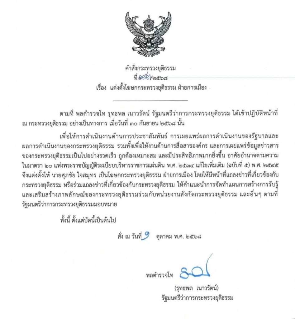 ตามที่ พลตำรวจโท รุทธพล เนาวรัตน์ รัฐมนตรีว่าการกระทรวงยุติธรรม ได้เข้าปฏิบัติหน้าที่ ณ กระทรวงยุติธรรม อย่างเป็นทางการ เมื่อวันที่ 30 กันยายน 2568 นั้น