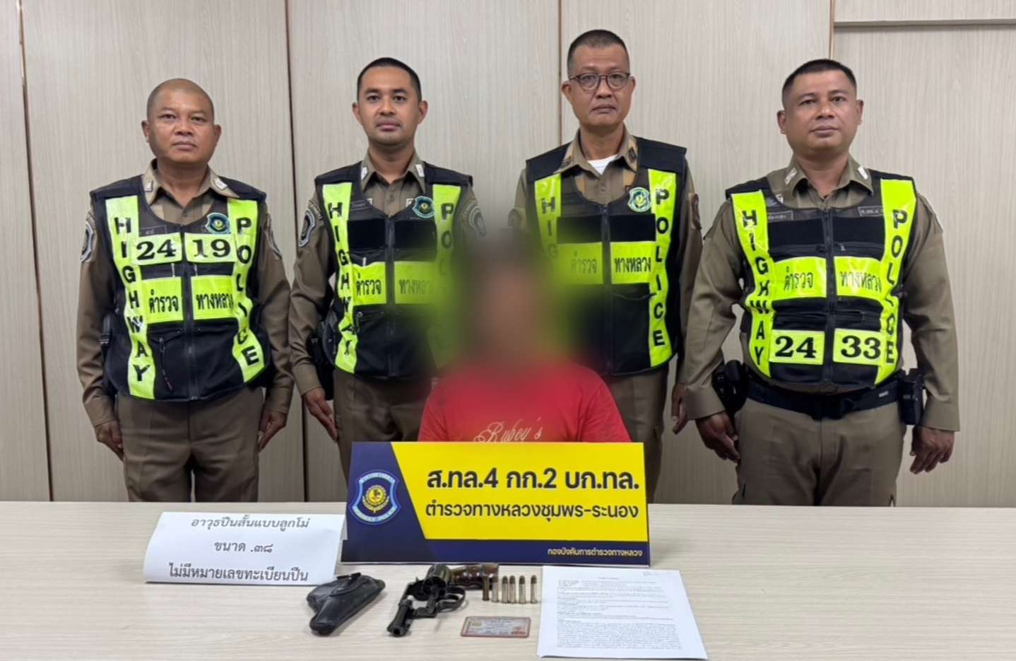 พร้อมตรวจยึดของกลางอาวุธปืนพกสั้นแบบลูกโม่ ขนาด .38 ยี่ห้อ สมิธแอนด์เวสสัน ขนาดลำกล้อง 3 นิ้ว ไม่มีหมายเลขประจำปืน ไม่มีหมายเลขทะเบียนปืน จำนวน 1 กระบอกเครื่องกระสุนปืน ขนาด .38 จำนวน 6 นัดซองพกหนังสีดำ 1 ซอง สถานที่จับกุม ริมถนน ทล.41 ขาล่องใต้ บริเวณ กม.7-8 ม.6 ต.ทุ่งคา อ.เมือง จ.ชุมพร