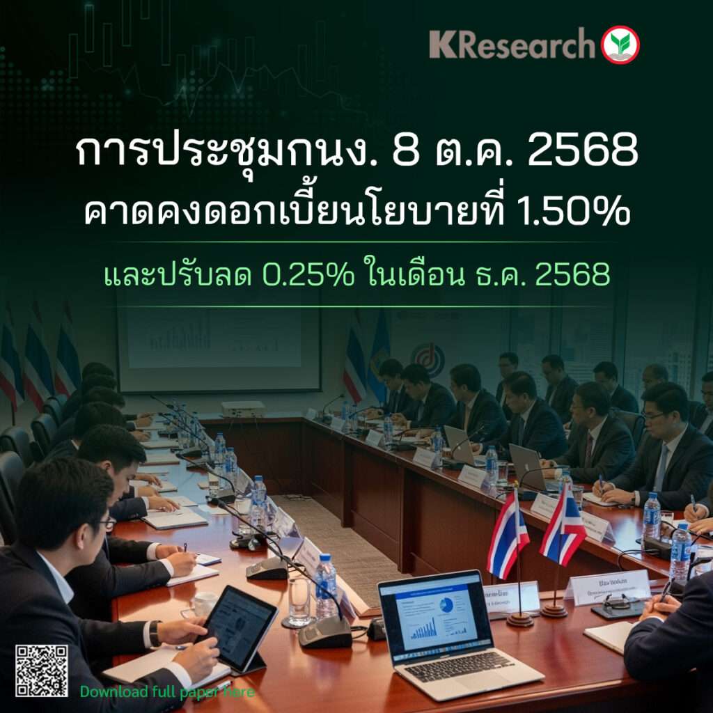 ศูนย์วิจัยกสิกรไทย ประเมินว่า กนง. จะพิจารณาปรับลดดอกเบี้ยนโยบายลงอีก 0.25% ในการประชุมเดือน ธ.ค. 68 และอาจปรับลดดอกเบี้ยนโยบายเพิ่มเติมในช่วงครึ่งแรกของปี 2569 เพื่อสนับสนุนการขยายตัวทางเศรษฐกิจ ซึ่งแนวโน้มการดำเนินนโยบายการเงินในระยะต่อไปมีทิศทางผ่อนคลายมากขึ้น โดยคณะกรรมการชุดใหม่มีแนวโน้มให้น้ำหนักกับความเสี่ยงด้านเศรษฐกิจมากขึ้น ควบคู่ไปกับการดูแลเสถียรภาพทางการเงิน