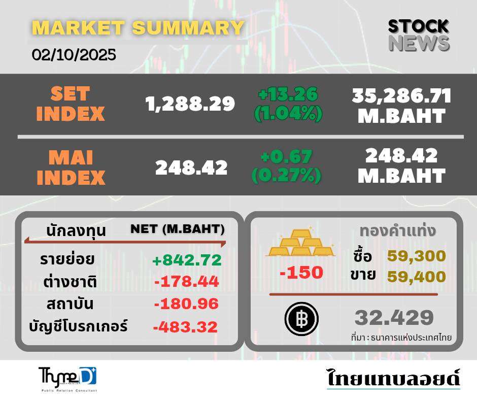 SET ปิดวันนี้ที่ 1,288.29 จุด เพิ่มขึ้น 13.26 จุด (+1.04%) มูลค่าซื้อขาย 35,286.71 ล้านบาท