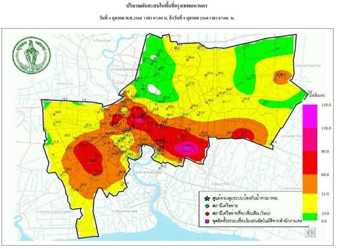 ในรอบ 24 ชั่วโมงที่ผ่านมา (นับถึงเวลา 07.00 น.) มีฝนตกหนักถึงหนักมากในหลายพื้นที่ โดยปริมาณฝนสูงสุดวัดได้ที่ บึงหนองบอน เขตประเวศ 122.0 มม. รองลงมาคือ บึงมักกะสัน เขตราชเทวี 100.5 มม., สำนักงานเขตพญาไท 94.0 มม., เขตพระโขนง 82.5 มม., เขตวัฒนา 82.0 มม. และเขตพระนคร 81.0 มม.