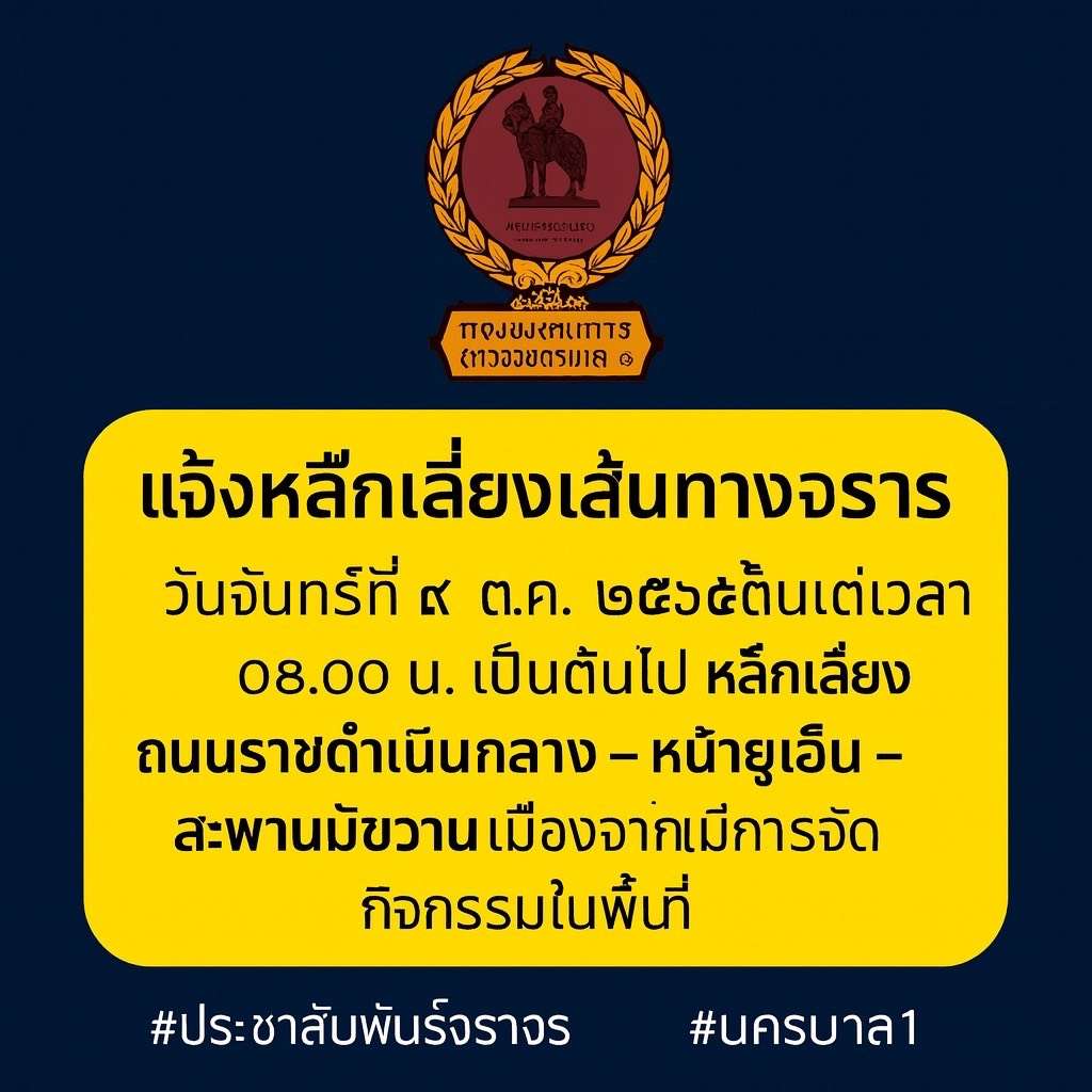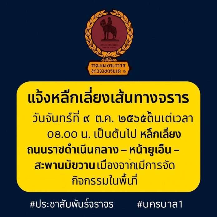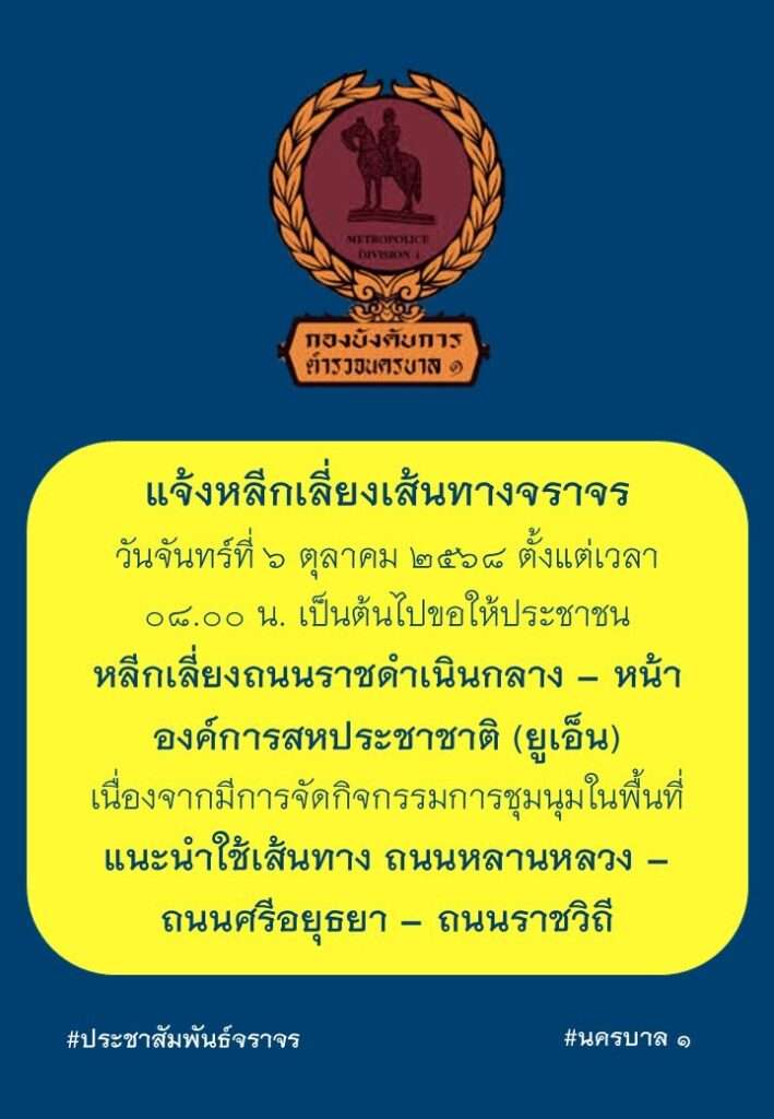กองบังคับการตำรวจนครบาล 1 ออกประกาศแจ้งประชาสัมพันธ์ว่า ในวันจันทร์ที่ 6 ตุลาคม 2568 ตั้งแต่เวลา 07.00 น. เป็นต้นไป ขอให้ประชาชนหลีกเลี่ยงการใช้เส้นทาง ถนนราชดำเนินกลาง บริเวณหน้าองค์การสหประชาชาติ (ยูเอ็น) เนื่องจากมีการจัดกิจกรรมการชุมนุมในพื้นที่