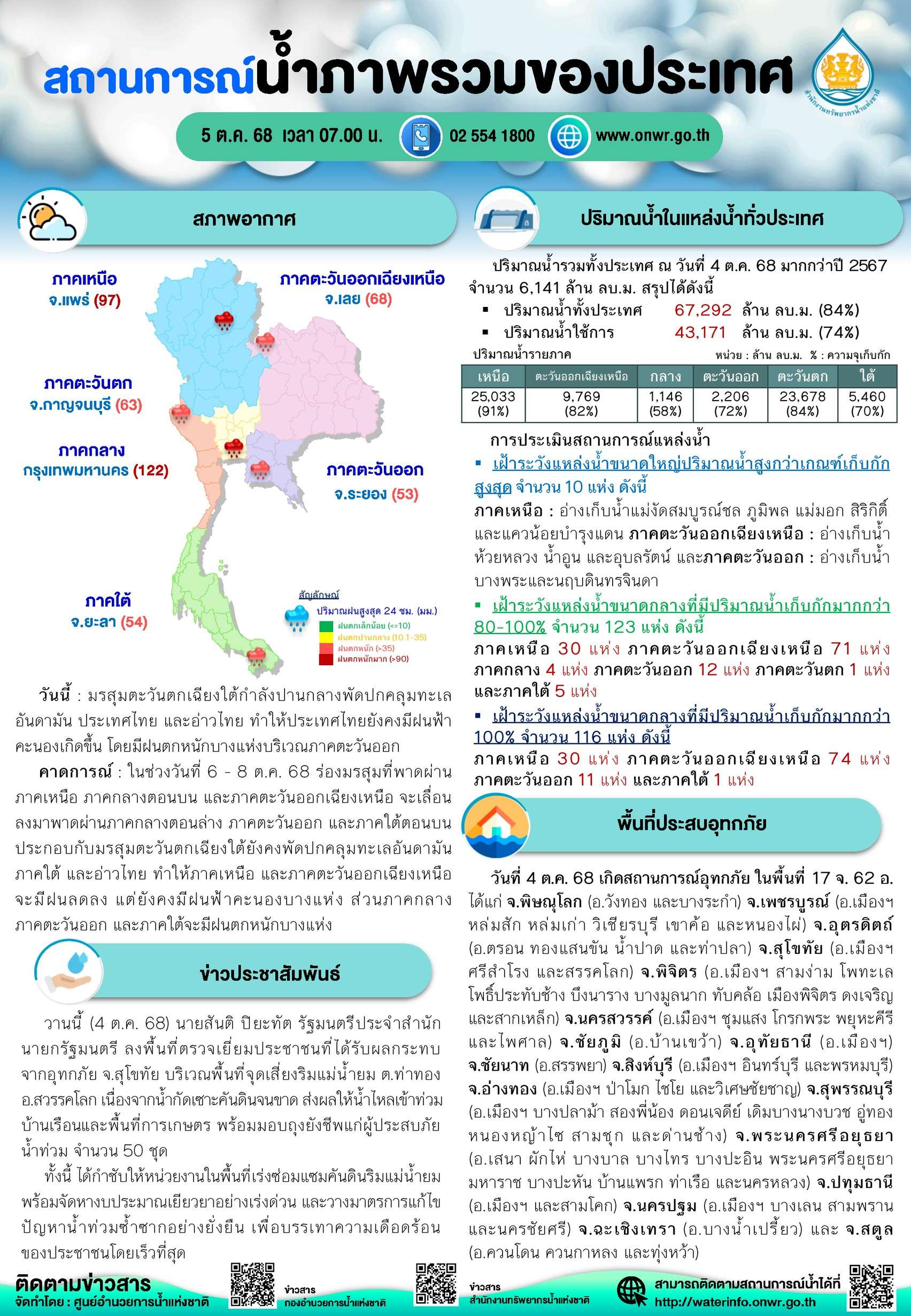 (4) พื้นที่ประสบอุทกภัย : วันที่ 4 ต.ค. 68 เกิดสถานการณ์อุทกภัย ในพื้นที่ 17 จ. 62 อ. ได้แก่ จ.พิษณุโลก (อ.วังทอง และบางระกำ) จ.เพชรบูรณ์ (อ.เมืองฯ หล่มสัก หล่มเก่า วิเชียรบุรี เขาค้อ และหนองไผ่) จ.อุตรดิตถ์ (อ.ตรอน ทองแสนขัน น้ำปาด และท่าปลา) จ.สุโขทัย (อ.เมืองฯ ศรีสำโรง และสรรคโลก) จ.พิจิตร (อ.เมืองฯ สามง่าม โพทะเล โพธิ์ประทับช้าง บึงนาราง บางมูลนาก ทับคล้อ เมืองพิจิตร ดงเจริญ และสากเหล็ก) จ.นครสวรรค์ (อ.เมืองฯ ชุมแสง โกรกพระ พยุหะคีรี และไพศาล) จ.ชัยภูมิ (อ.บ้านเขว้า) จ.อุทัยธานี (อ.เมืองฯ) จ.ชัยนาท (อ.สรรพยา) จ.สิงห์บุรี (อ.เมืองฯ อินทร์บุรี และพรหมบุรี) จ.อ่างทอง (อ.เมืองฯ ป่าโมก ไชโย และวิเศษชัยชาญ) จ.สุพรรณบุรี (อ.เมืองฯ บางปลาม้า สองพี่น้อง ดอนเจดีย์ เดิมบางนางบวช อู่ทอง หนองหญ้าไซ สามชุก และด่านช้าง) จ.พระนครศรีอยุธยา (อ.เสนา ผักไห่ บางบาล บางไทร บางปะอิน พระนครศรีอยุธยา มหาราช บางปะหัน บ้านแพรก ท่าเรือ และนครหลวง) จ.ปทุมธานี (อ.เมืองฯ และสามโคก) จ.นครปฐม (อ.เมืองฯ บางเลน สามพราน และนครชัยศรี) จ.ฉะเชิงเทรา (อ.บางน้ำเปรี้ยว) และ จ.สตูล (อ.ควนโดน ควนกาหลง และทุ่งหว้า)