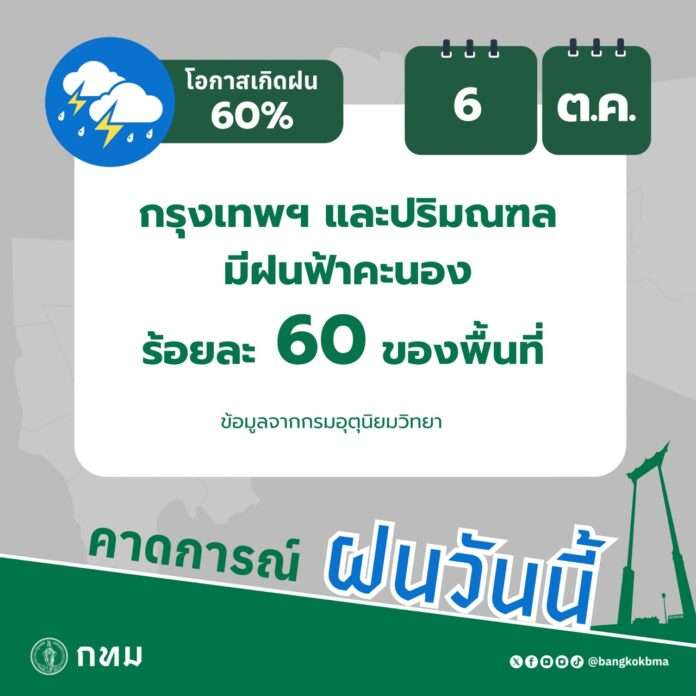 สำหรับกรุงเทพมหานครและปริมณฑล ยังคงมีฝนฟ้าคะนองร้อยละ 60 ของพื้นที่ อุณหภูมิ 23–32 องศาเซลเซียส วานนี้ (5 ต.ค.) พบฝนปานถึงหนักหลายจุด ปริมาณฝนสูงสุดที่เขตบางขุนเทียน 98.5 มม. รองลงมาคือเขตจอมทอง 89.5 มม. และบางนา 78.5 มม. กรุงเทพมหานครเร่งระบายน้ำถนนสายหลัก 11 จุด ปัจจุบันแห้งกลับสู่ปกติแล้ว
