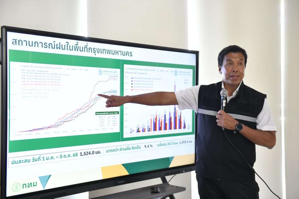 สถานการณ์ฝนในเดือนตุลาคมนี้ ช่วงวันที่ 6-8 ตุลาคม 2568 จะมีฝนตกเพิ่มขึ้น จากอิทธิพลหย่อมความกดอากาศต่ำ ที่อ่อนกำลังลงจากพายุ “แมตโม” ช่วงวันที่ 9-14 ตุลาคม 2568 มีฝนกระจาย และฝนตกหนักบางแห่ง กรุงเทพมหานครและปริมณฑล เนื่องจากร่องมรสุมจะเลื่อนลงมาพาดผ่านบริเวณดังกล่าวต้องระวังฝนตกหนัก และฝนตกสะสม โดยเฉพาะพื้นที่ท้ายเขื่อนเจ้าพระยา และลุ่มน้ำต่างๆ อาจมีระดับสูงขึ้น ช่วงวันที่ 15-20 ตุลาคม 2568 และช่วงแรก ๆ โดยภาพรวมถือว่ายังปกติถึงแม้ว่าช่วงกลางเดือนจะมีฝนตกที่ไม่ใช่พายุ ระดับแม่น้ำเจ้าพระยายังคงไม่ถึงภาวะวิกฤต