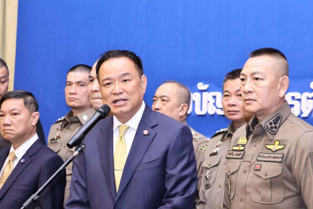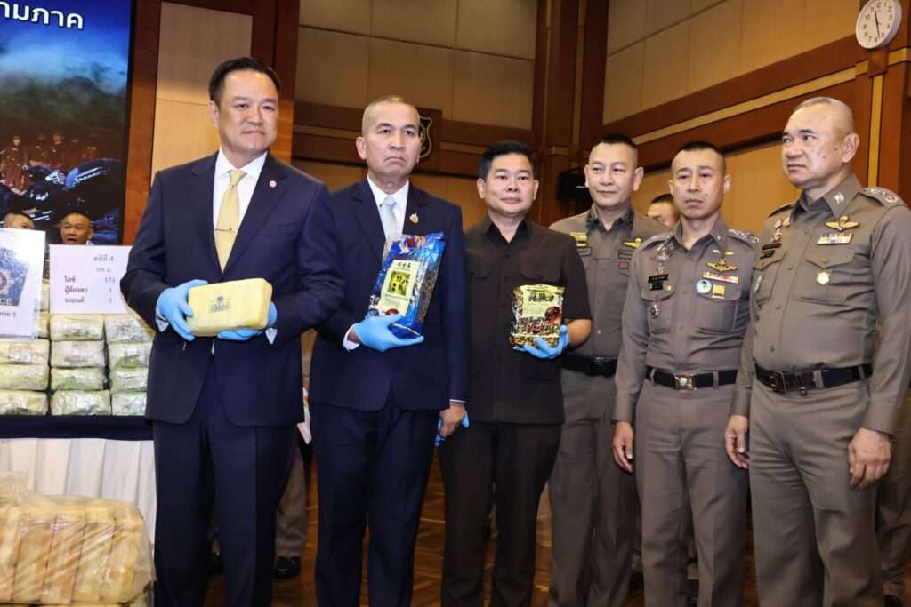 กองบัญชาการตำรวจปราบปรามยาเสพติด (บช.ปส.)-8 ตุลาคม 2568 นายอนุทิน ชาญวีรกุล นายกรัฐมนตรีและรัฐมนตรีว่าการกระทรวงมหาดไทย พร้อมด้วย พล.ต.ท.รุทธพล เนาวรัตน์ รัฐมนตรีว่าการกระทรวงยุติธธรรม พล.ต.อ.กิตติ์รัฐ พันธุ์เพ็ชร์ ผู้บัญชาการตำรวจแห่งชาติ, พ.ต.ต.สุริยา สิ่งหกมล เลขาธิการคณะกรรมการป้องกันและปราบปรามยาเสพและเจ้าหน้าที่ที่เกี่ยวข้องร่วมกันแถลงยุทธการล้างบางเครือข่ายยาเสพติดข้ามภาค