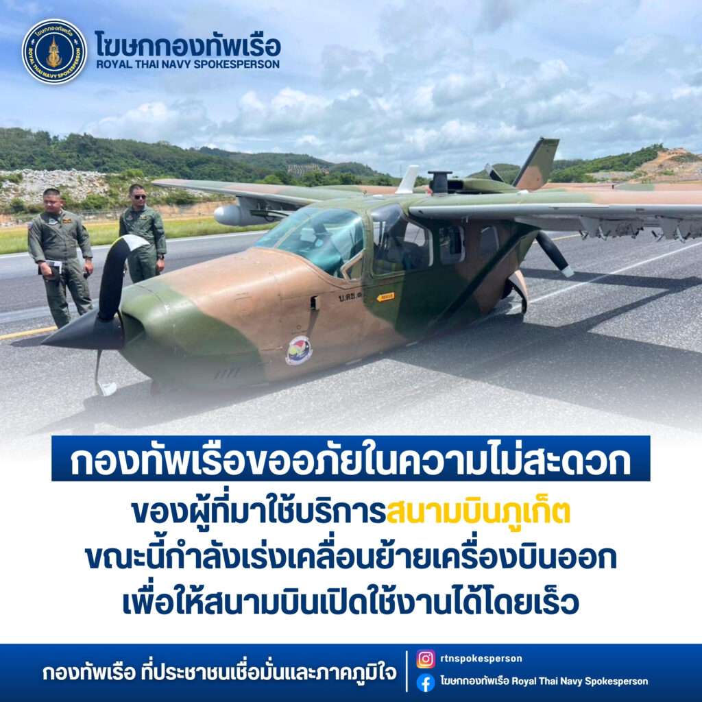 โฆษกกองทัพเรือกล่าวว่า ขณะนำเครื่องบินลงจอดและนักบินตรวจพบว่าล้อกางไม่สมบูรณ์ จึงได้ปฏิบัติตามคู่มือในการลงจอดฉุกเฉินเพื่อลดความเสียหายของอากาศยาน ในขณะที่ นักบินได้รับความปลอดภัย ขณะนี้ เครื่องบินกีดขวางอยู่บนทางวิ่งของสนามบิน (รันเวย์) ส่งผลให้กระทบตารางการบินทั้งขาเข้าและ ขาออก โดยกองทัพเรือร่วมกับท่าอากาศยานนานาชาติภูเก็ต กำลังเร่งรัดการเคลื่อนย้ายอากาศยาน เพื่อไม่ให้กีดขวาง ซึ่งอาจต้องใช้เวลา 1-2 ชั่วโมง ทั้งนี้กองทัพเรือจะสอบสวนหาสาเหตุเพื่อป้องกันมิให้เกิดเหตุดังกล่าวขึ้นอีก กองทัพเรือต้องขออภัยต่อผู้มาใช้บริการสนามบินในความไม่สะดวกที่เกิดขึ้นจากเหตุการณ์นี้ด้วย