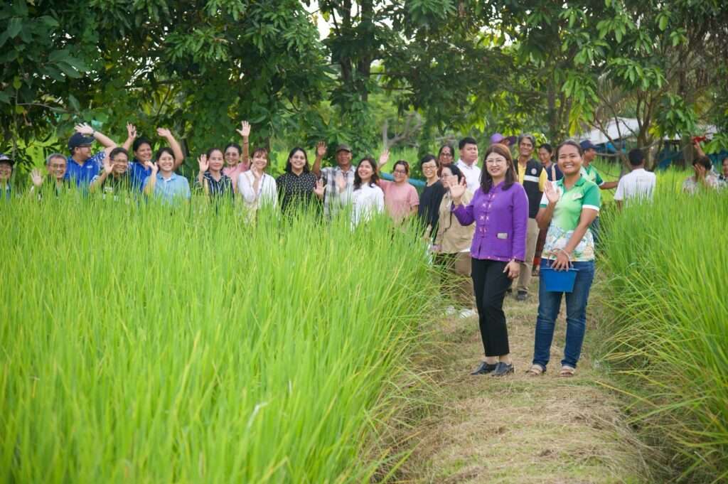 โอกาสนี้ กรมประมงจึงได้นำคณะทำงาน GeNA Project ซึ่งเป็นผู้แทนจากเวทีประชุม GAF9 ลงพื้นที่ติดตามโครงการนำร่อง “การเลี้ยงปลาในนาข้าว” ณ จังหวัดมหาสารคาม ระหว่าง วันที่ 7-8 ตุลาคม 2568 ซึ่งดำเนินการใน 3 ประเทศ ได้แก่ ประเทศไทย ฟิลิปปินส์ และกัมพูชา ในการลงพื้นที่ครั้งนี้ คณะทำงานได้เยี่ยมชมการดำเนินงานของเกษตรกรที่เข้าร่วมโครงการจำนวน 5 ราย จากทั้งหมด 31 ราย ในพื้นที่ อ.พยัคฆภูมิพิสัย และ อ.โกสุมพิสัย เพื่อแลกเปลี่ยนประสบการณ์และติดตามผลการนำแนวทางการเพาะเลี้ยงสัตว์น้ำที่สอดคล้องกับการปรับตัวต่อการเปลี่ยนแปลงสภาพภูมิอากาศและมิติความเท่าเทียมทางเพศในการประมง โดยโครงการนี้มุ่งบูรณาการแนวคิด “Nature-based Solution” (NbS) หรือการใช้ธรรมชาติเป็นฐานในการพัฒนา เปิดโอกาสให้ประเทศไทยได้นำเสนอการขับเคลื่อนนโยบายสู่การปฏิบัติจริงในพื้นที่ โดยส่งเสริมให้เกษตรกรเลี้ยงปลาในนาข้าวตามแนวทางธรรมชาติ ซึ่งช่วยลดผลกระทบจากการเปลี่ยนแปลงของสภาพภูมิอากาศ ลดต้นทุนการผลิต และเพิ่มผลผลิตสัตว์น้ำ พร้อมสร้างสมดุลระหว่างการผลิตอาหาร การอนุรักษ์สิ่งแวดล้อม และการสร้างรายได้ให้แก่เกษตรกรในพื้นที่อย่างยั่งยืน ตามนโยบายของ ร้อยเอกธรรมนัส พรหมเผ่า รองนายกรัฐมนตรีและรัฐมนตรีว่าการกระทรวงเกษตรและสหกรณ์ นอกจากนี้ โครงการฯ ยังให้ความสำคัญกับการเสริมพลังสตรีในชุมชนท้องถิ่น เพื่อให้มีบทบาทสำคัญในกระบวนการบริหารจัดการฟาร์ม การตัดสินใจ และการแบ่งปันผลประโยชน์อย่างเท่าเทียม ซึ่งเป็นการยกระดับคุณภาพชีวิตและสร้างความเข้มแข็งให้กับครอบครัวและชุมชนอย่างยั่งยืน
