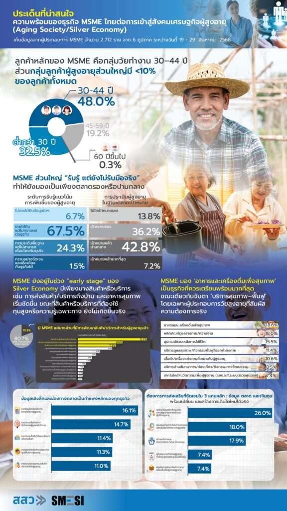 แม้ว่านโยบายสนับสนุนจากภาครัฐอาจต้องใช้เวลาในการดำเนินการ แต่ SME สามารถเริ่มต้นสร้างโอกาสใหม่ทางธุรกิจได้ทันที โดยเฉพาะการพัฒนาผลิตภัณฑ์ อาหาร และเครื่องดื่มเพื่อสุขภาพ รวมถึงการปรับโครงสร้างร้านและสถานประกอบการให้ปลอดภัยและสะดวกต่อการใช้งานของกลุ่มผู้สูงอายุ อีกทั้งการทดลองตลาดเพื่อเก็บข้อมูลและนำมาพัฒนาสินค้าและบริการให้ตอบโจทย์ความต้องการได้ตรงจุด ขณะเดียวกันธุรกิจที่ต้องอาศัยเงินลงทุนสูง เช่น การใช้เทคโนโลยีและนวัตกรรมเพื่อการดูแลผู้สูงอายุ ก็นับเป็นอีกหนึ่งโอกาสสำคัญที่ SME สามารถต่อยอดสู่การลงทุนในอนาคตได้