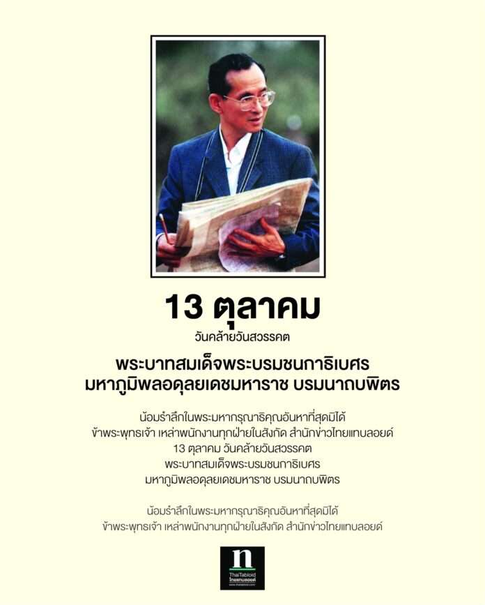 เนื่องในวันคล้ายวันสวรรคตพระบาทสมเด็จพระบรมชนกาธิเบศร มหาภูมิพลอดุลยเดชมหาราช บรมนาถบพิตร “วันนวมินทรมหาราช” 13 ตุลาคม 2568 วันคล้ายวันสวรรคต พระบาทสมเด็จพระบรมชนกาธิเบศร มหาภูมิพลอดุลยเดชมหาราช บรมนาถบพิตร