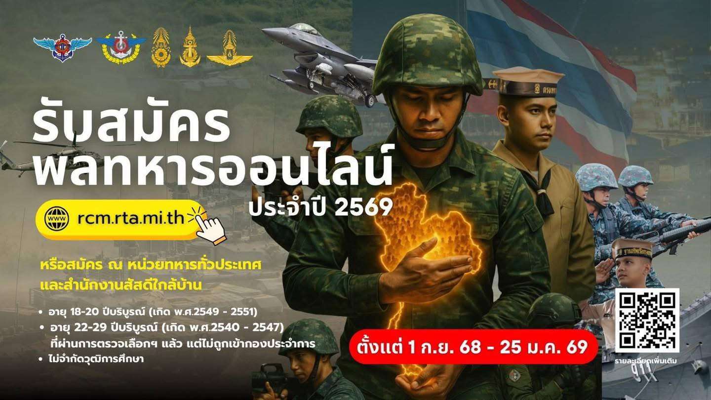โอกาสดีสำหรับชายไทย! กองทัพบกเปิดรับสมัครคัดเลือกทหารกองเกินเข้ารับราชการทหารกองประจำการ ปี 2569 ด้วยระบบออนไลน์ สมัครได้ทั่วประเทศกว่า 594 หน่วย ตั้งแต่วันที่ 1 ก.ย. 2568 – 25 ม.ค. 2569 ผ่านเว็บไซต์ rcm.rta.mi.th ตลอด 24 ชั่วโมง
