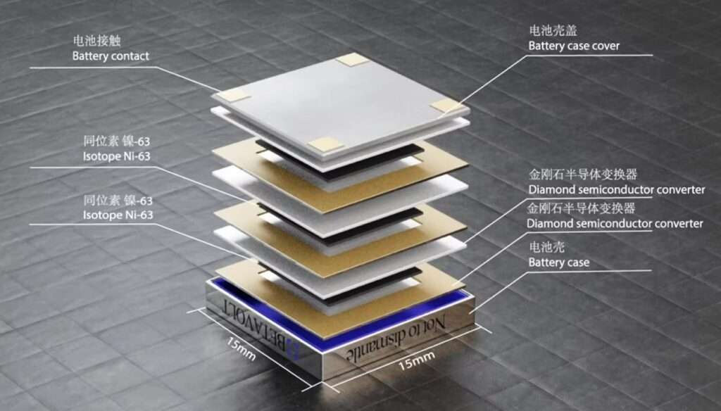 ความก้าวหน้าครั้งแรกมาจาก Betavolt ซึ่งเพิ่งเปิดตัว BV100 แบตเตอรี่นิวเคลียร์ต้นแบบที่ใช้พลังงานจาก Nickel-63 ไอโซโทปนี้ปล่อยอนุภาคบีตาที่มีพลังงานต่ำมาก ซึ่งทำให้ปลอดภัยกว่าแหล่งกำเนิดรังสีแกมมาหรือแอลฟาที่ใช้ในระบบกัมมันตภาพรังสีขนาดใหญ่