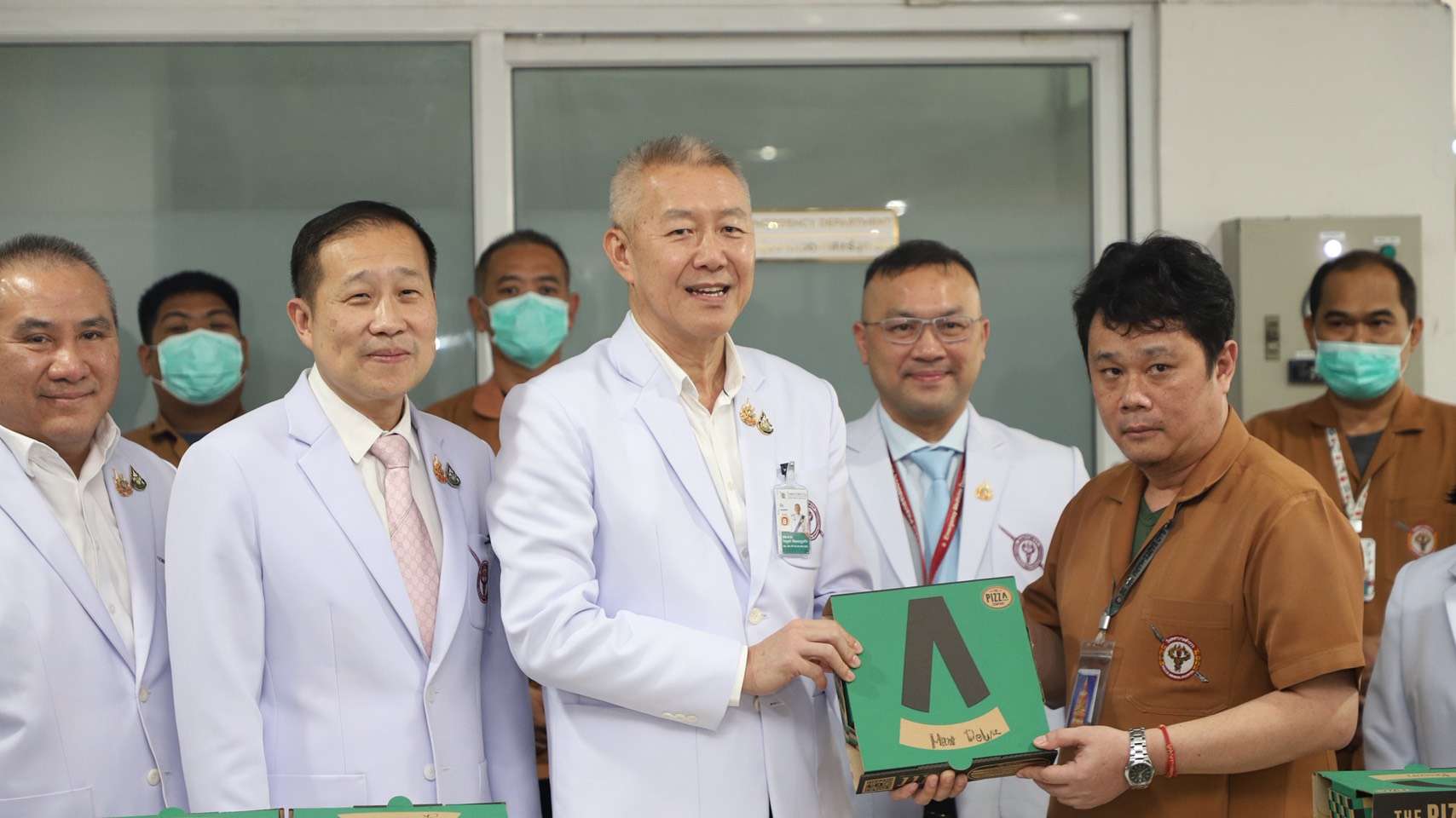 โดยเมื่อเสร็จสิ้นภารกิจตรวจเยี่ยมข้าราชการตำรวจที่ได้รับบาดเจ็บ คณะผู้บังคับบัญชาระดับสูงของโรงพยาบาลตำรวจ ยังได้เดินทางไปมอบขวัญกำลังใจ พร้อมมอบอาหาร (พิซซ่า) แก่เจ้าหน้าที่เวรเปลของโรงพยาบาลตำรวจ ณ อาคาร มภร. ชั้น 2 โรงพยาบาลตำรวจเพื่อแสดงความขอบคุณและสร้างขวัญกำลังใจให้แก่เจ้าหน้าที่เวรเปล ซึ่งมีบทบาทสำคัญในการดูแลและอำนวยความสะดวกด้านการรับ–ส่งผู้ป่วยภายในโรงพยาบาลอย่างต่อเนื่อง ถือเป็นการส่งเสริมความสัมพันธ์อันดีระหว่างผู้บริหารและบุคลากร ตลอดจนเป็นการสร้างแรงจูงใจให้เจ้าหน้าที่ทุกระดับมุ่งมั่นปฏิบัติหน้าที่ด้วยความเสียสละและมีประสิทธิภาพ