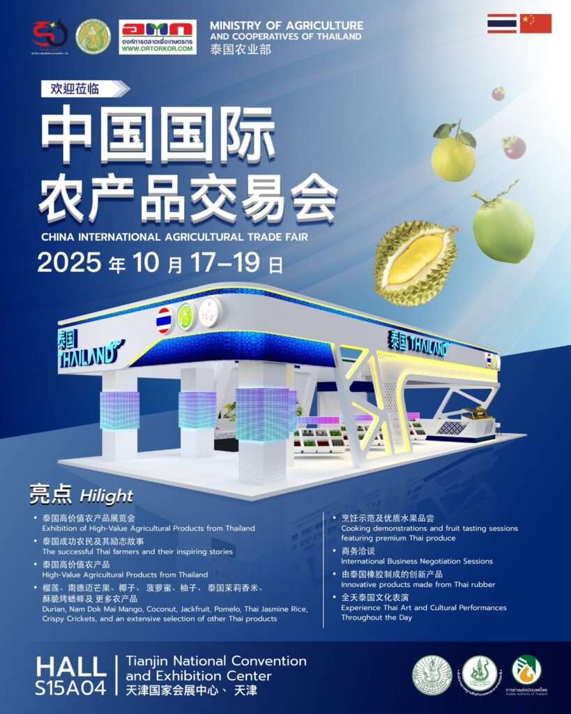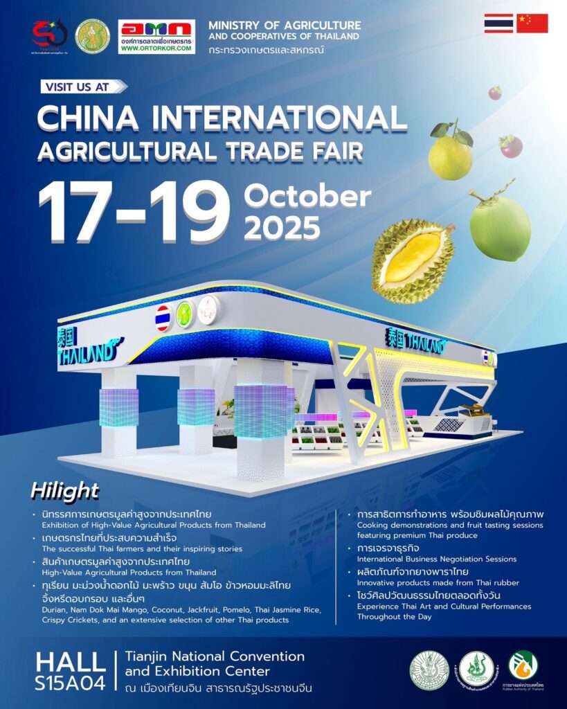 องค์การตลาดเพื่อเกษตรกร (อ.ต.ก.) เดินหน้าผลักดันสินค้าเกษตรไทยสู่ตลาดโลก ขนผลไม้คุณภาพสูง สินค้าเกษตรแปรรูป ภายใต้โครงการ “Thailand Agri Intertrade 2025” พร้อมนำนวัตกรรม Smart Farming เข้าร่วมโชว์ศักยภาพในงาน China International Agricultural Trade Fair 2025 หรือ CATF 2025 ซึ่งจัดขึ้นระหว่างวันที่ 17–19 ตุลาคม 2568 ณ เมืองเทียนจิน สาธารณรัฐประชาชนจีน โดยจีนเป็นตลาดส่งออกผลไม้ไทยรายใหญ่ที่สุด และมีความต้องการผลไม้เมืองร้อนเพิ่มขึ้นอย่างต่อเนื่อง ผลไม้ไทยที่ได้รับความนิยมสูง อาทิ ทุเรียน มะม่วงน้ำดอกไม้ มังคุด มะพร้าว ลองกอง และลำไย เป็นที่ชื่นชอบของผู้บริโภคชาวจีน รวมทั้งผลไม้อบแห้ง ซึ่งก็ได้รับความนิยมสูงเช่นกัน สะท้อนศักยภาพของไทยในฐานะผู้นำตลาดผลไม้เมืองร้อนของจีน จึงนับเป็นโอกาสดีในการสร้างโอกาสทางการค้าใหม่ ๆ ขยายฐานผู้บริโภคในตลาดที่มีศักยภาพสูงที่สุดแห่งหนึ่งของโลก