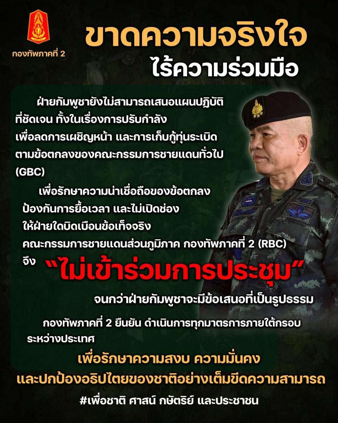เหตุผลที่กองทัพภาคที่ 2 ปฏิเสธเข้าร่วม คือ ฝ่ายกัมพูชายังไม่สามารถจัดทำ “แผนการปรับกำลังเพื่อลดการเผชิญหน้า” และ “แผนการเก็บกู้ทุ่นระเบิด” ตามข้อตกลงของคณะกรรมการชายแดนทั่วไป (GBC) ได้อย่างเป็นรูปธรรม อีกทั้งยังขาดความชัดเจนในการเสนอแนวทางปฏิบัติร่วมกัน ซึ่งทำให้ไม่สามารถเข้าร่วมการประชุมได้ในเวลานี้