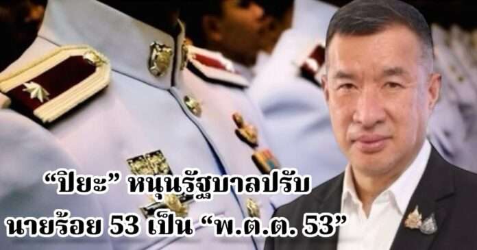 “โครงการปรับเลื่อนยศ ‘นายร้อย53’ จาก นายดาบตำรวจ (ด.ต.) เป็น ร้อยตำรวจตรี และรับราชการอีก 7 ปี ติดยศ ร้อยตำรวจเอก (ร.ต.อ.)ก่อนเกษียณอายุราชการ เพื่อสร้างขวัญกำลังใจให้ตำรวจชั้นประทวน ที่ทุ่มเททำงานมาจนวัยใกล้เกษียณนั้น เริ่มต้นจากช่วงปลายปี 2554 สมัยที่ตนดำรงตำแหน่ง เลขานุการ สำนักงานตำรวจแห่งชาติ ได้มีแนวความคิดและมีการศึกษาเรื่องดังกล่าว และ ร.ต.อ.เฉลิม อยู่บำรุง รองนายกฯรัฐมนตรี(ในสมัยนั้น) ได้ผลักดันเรื่องดังกล่าวจนผ่านการประชุม ค.ร.ม. เมื่อวันที่ 6 มี.ค. พ.ศ. 2555 จากปี พ.ศ. 2555 จนปัจจุบันนี้ มีการอบรมและประดับยศ ร.ต.ต. ไปแล้วรวม 14 รุ่น” พล.ต.ท.ปิยะ กล่าว