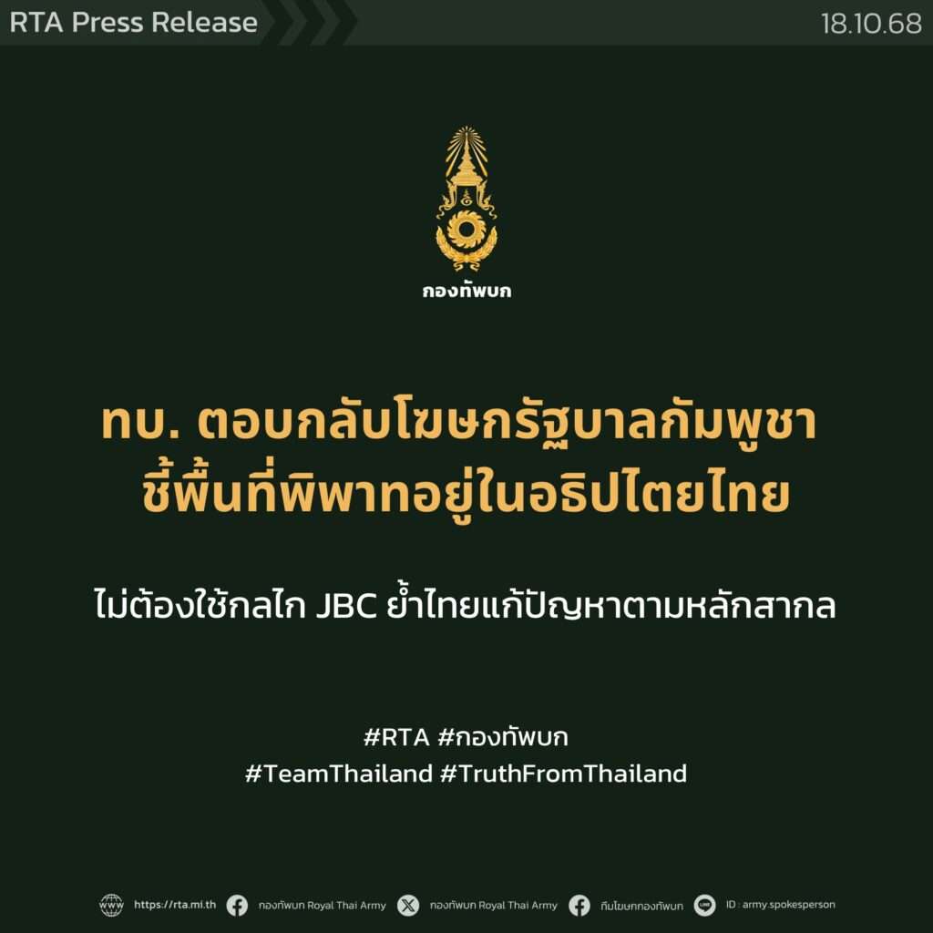 โฆษก ทบ. กล่าวว่า โดยเฉพาะบริเวณพื้นที่ชายแดนที่มีลักษณะเป็นพื้นที่ราบ ตามสนธิสัญญาสยามฝรั่งเศส ระบุให้ใช้หลักเขตแดน ที่ได้เคยปักปันกันไว้แล้วในอดีตเป็นหลัก ซึ่งในบางหลักเขตอาจมีความเห็นไม่ตรงกันบ้าง จึงเกิดเป็นพื้นที่ ที่ต่างฝ่ายต่างอ้างสิทธิ์ ทำให้ต้องใช้กลไกคณะกรรมการเขตแดนร่วม หรือ JBC มาร่วมแก้ปัญหา