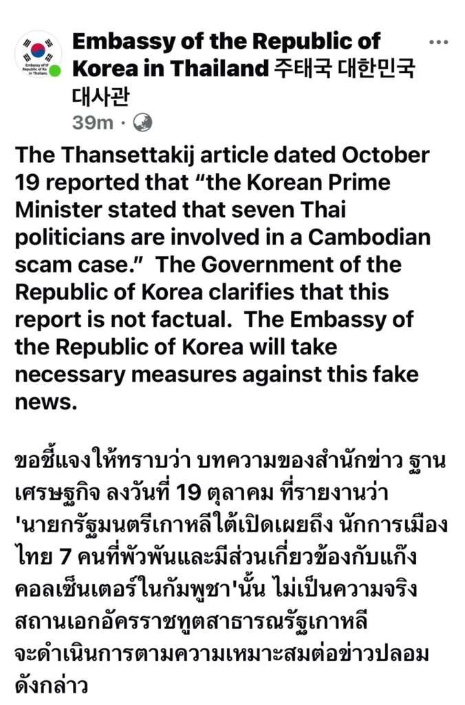 เมื่อวันที่ 19 ตุลาคม 2568​ ผู้สื่อข่าวรายงานกรณี​ สำนักข่าวแห่งหนึ่งของไทย​รายงานว่า “นายกรัฐมนตรีเกาหลีใต้ระบุ นักการเมืองไทย 7 คน มีส่วนเกี่ยวข้องกับแก๊งคอลเซ็นเตอร์ในกัมพูชา” ซึ่งต่อมา รัฐบาลสาธารณรัฐเกาหลีใต้ฯ​ ได้ออกมาชี้แจงผ่านเพจสถานเอกอัครราชทูตสาธารณรัฐเกาหลีประจำประเทศไทยว่า รายงานดังกล่าว ไม่เป็นความจริง