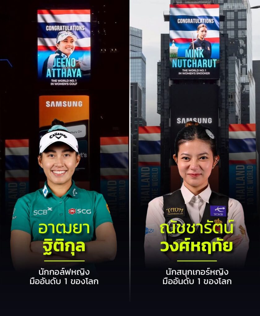 สุดอลังการ! “โปรจีน” อาฒยา ฐิติกุล นักกอล์ฟหญิงมือ 1 ของโลก และ “น้องมิ้งค์” ณัชชารัตน์ วงศ์หฤทัย นักสนุกเกอร์หญิงมือ 1 ของโลก ขึ้นป้ายบิลบอร์ดยักษ์กลาง Times Square ใจกลางมหานครนิวยอร์ก สหรัฐอเมริกา สะท้อนความภาคภูมิใจของวงการกีฬาหญิงไทยที่ก้าวไกลระดับโลก