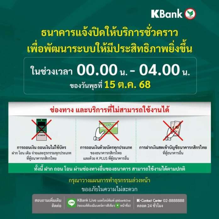 ธนาคารกสิกรไทย แจ้งปิดให้บริการชั่วคราว เป็นเวลา 4 ชั่วโมง เพื่อพัฒนาระบบให้มีประสิทธิภาพยิ่งขึ้น ในวันพุธที่ 15 ตุลาคม 2568 เวลา 00.00-04.00 น. โดยช่องทางและบริการที่ไม่สามารถใช้งานได้ ดังนี้