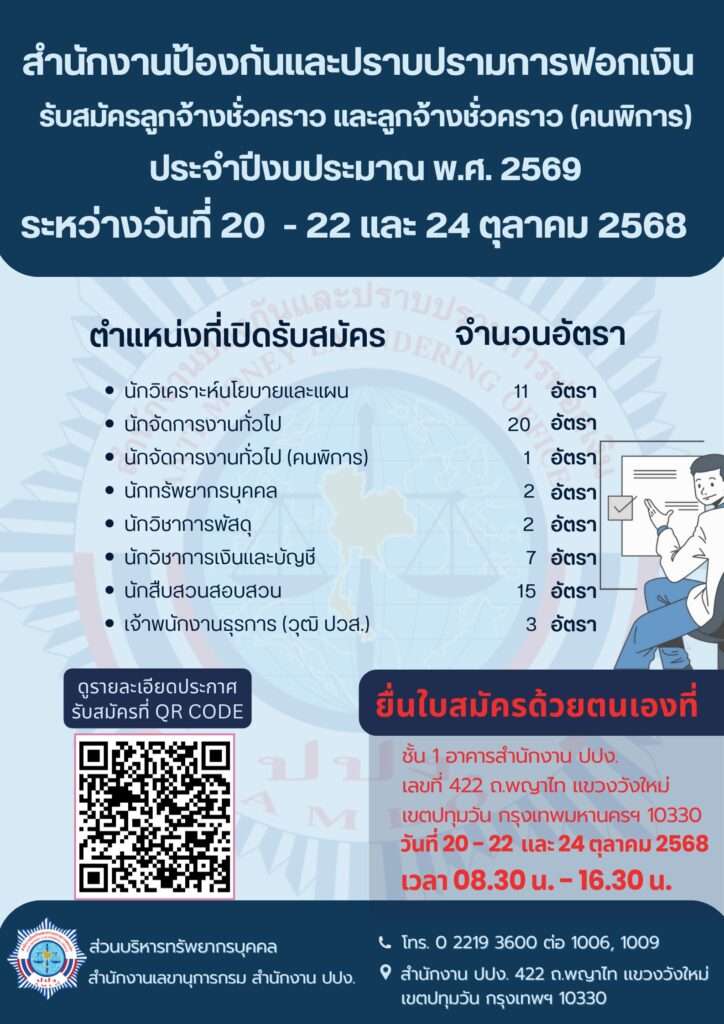 ปปง. ประกาศรับสมัครลูกจ้างชั่วคราวและลูกจ้างชั่วคราว (คนพิการ) ประจำปีงบประมาณ 2569 ผู้สนใจยื่นใบสมัครได้ระหว่างวันที่ 20–22 และ 24 ต.ค. 2568 ณ อาคารสำนักงาน ปปง.