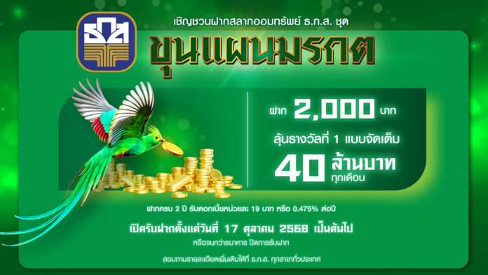 สลากออมทรัพย์ ธ.ก.ส. ชุด ขุนแผนมรกต ฝาก 2,000 บาท ครบ 2 ปี รับดอกเบี้ยหน่วยละ 19 บาท ลุ้นรวย 40 ล้านบาท เริ่ม 17 ต.ค. 68
