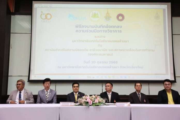 เชียงใหม่, วันที่ 21 ต.ค. – สถาบันส่งเสริมความปลอดภัย อาชีวอนามัย และสภาพแวดล้อมในการทำงาน (องค์การมหาชน) หรือ สสปท. เปิดมิติใหม่ในการสร้างวัฒนธรรมความปลอดภัย จากภาคการศึกษา โดยได้ลงนามบันทึกข้อตกลงความร่วมมือทางวิชาการ (MOU) กับ มหาวิทยาลัยเทคโนโลยีราชมงคลล้านนา (มทร.ล้านนา) จังหวัดเชียงใหม่ เพื่อร่วมกันยกระดับมาตรฐาน Safety, Health and Environment (SHE) ภายในสถาบันการศึกษา และปลูกฝัง “จิตสำนึกด้านความปลอดภัย” (จป.) แก่นักศึกษา ภายใต้โครงการ “จป.พันธุ์ใหม่ สู่วัฒนธรรมความปลอดภัยที่ยั่งยืน” โดยมี ดร.นันทชัย ปัญญาสุรฤทธิ์ ผู้อำนวยการ สสปท. และ รศ.วิเชษฐ์ ทิพย์ประเสริฐ รักษาราชการแทนอธิการบดี มทร.ล้านนา ร่วมลงนาม โดยมีผู้บริหาร คณาจารย์ และนักศึกษาร่วมเป็นสักขีพยาน