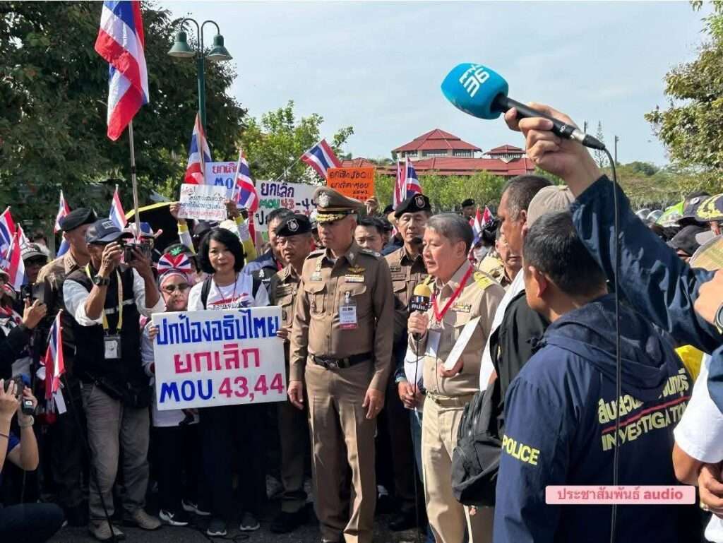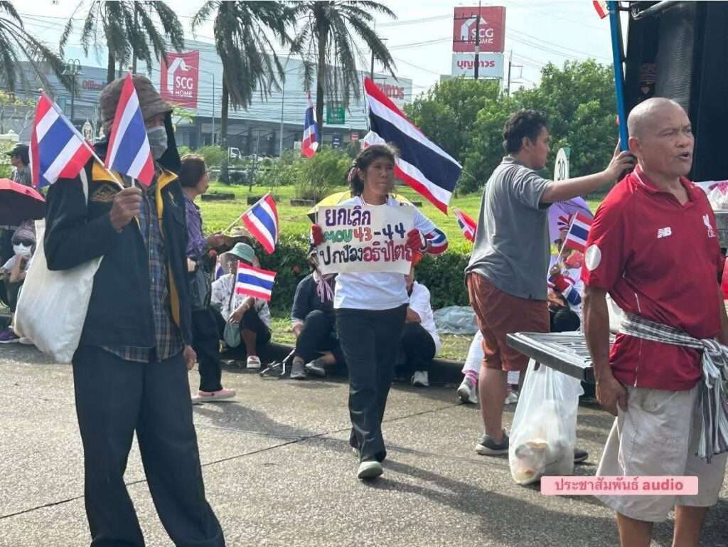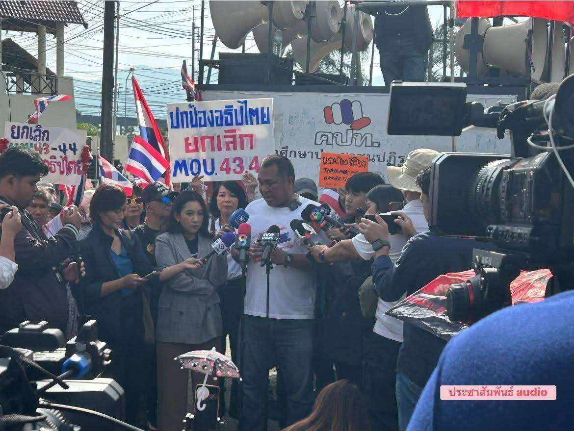 ประชาชนและแกนนำเครือข่าย คปท. รวมตัวแน่นหน้าโรงแรมมณีจันทร์ จังหวัดจันทบุรี เรียกร้องให้ยุติการประชุมคณะกรรมาธิการชายแดนไทย–กัมพูชา (JBD) จนกว่าจะมีการแก้ไข 4 ประเด็นหลัก ทั้งการเก็บกู้ทุ่นระเบิด ปราบสแกนเมอร์ ถอนอาวุธหนัก และจัดระเบียบพื้นที่ชายแดน