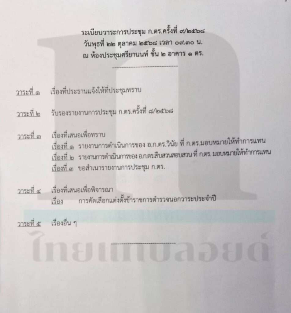 โดยมีวาระน่าสนใจ คือ การขอมติ จาก ก.ตร. เพื่อขอแต่งตั้งนอกวาระประจำปี ทดแทน พล.ต.ท.นัยวัฒน์ ผะเดิมชิต รองจเรตำรวจแห่งชาติ พล.ต.ต.วัชรินทร์ พูสิทธิ์ รองจเรตำวจ และ พล.ต.ต.นิรันดร์ ทองฤทธิ์ ผบก.ศพฐ.3 ที่ยื่นเออร์ลี่รีไทร์ รอบเดือนตุลาคม ปีงบประมาณ 2569 มีผล 1 ตุลาคม 2568 ทำให้มีตำแหน่งว่างระดับผู้ช่วย ผบ.ตร. 1 ตำแหน่ง ผบช. 1 ตำแหน่ง รอง ผบช. 1 ตำแหน่ง และผบก. 3 ตำแหน่ง