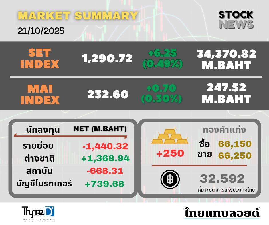 SET ปิดวันนี้ที่ 1,290.72 จุด เพิ่มขึ้น 6.25 จุด (+0.49%) มูลค่าซื้อขาย 34,370.82 ล้านบาท