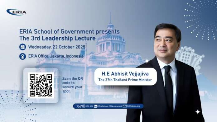เวที ERIA School of Government Leadership Lecture นับเป็นอีกหนึ่งโอกาสสำคัญที่แสดงให้เห็นถึงบทบาทของนายอภิสิทธิ์ เวชชาชีวะ ในฐานะผู้นำที่ยังคงมีอิทธิพลทางความคิดในเวทีระหว่างประเทศ และเป็นแบบอย่างของผู้นำที่ใช้เหตุผล ความรู้ และหลักคุณธรรมในการขับเคลื่อนสังคม ที่เป็นแรงบันดาลใจให้กับผู้นำรุ่นใหม่และนักนโยบายทั่วภูมิภาค