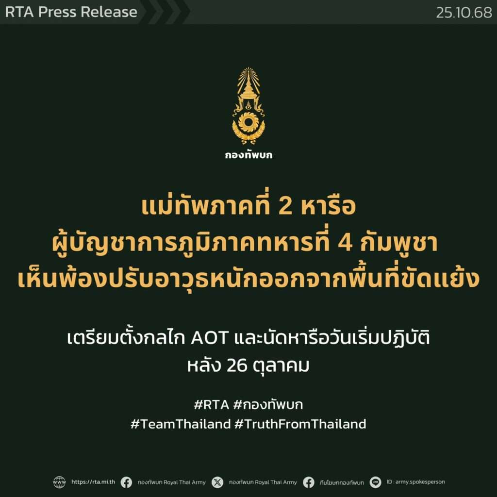 กองทัพบก, วันที่ 25 ตุลาคม – พลตรีวินธัย สุวารี โฆษกกองทัพบก เปิดเผยถึงผลการประชุมหารือระหว่างแม่ทัพภาคที่ 2 และผู้บัญชาการภูมิภาคทหารที่ 4 ในประเด็นการปรับอาวุธหนักและอาวุธที่มีการยิงทำลายออกจากพื้นที่ขัดแย้ง ซึ่งได้จัดขึ้น ณ จุดผ่านแดนช่องจอม อำเภอกาบเชิง จังหวัดสุรินทร์ เมื่อเวลา 10.30 น. ที่ผ่านมาว่า การประชุมหารือดังกล่าว สืบเนื่องจากผลการประชุมคณะกรรมการชายแดนทั่วไป (General Border Committee – GBC) ไทย–กัมพูชา สมัยพิเศษ ครั้งที่ 2 ระหว่างวันที่ 20–23 ตุลาคม 2568 ณ กรุงกัวลาลัมเปอร์ ประเทศมาเลเซีย ที่ทั้งสองฝ่ายได้เห็นชอบ “แผนปฏิบัติการ (Action Plan)” ว่าด้วยการปรับอาวุธหนักและอาวุธที่มีการยิงทำลายออกจากพื้นที่ขัดแย้ง เพื่อสร้างสภาวะแวดล้อมที่เอื้อต่อการแก้ไขปัญหาโดยสันติวิธี