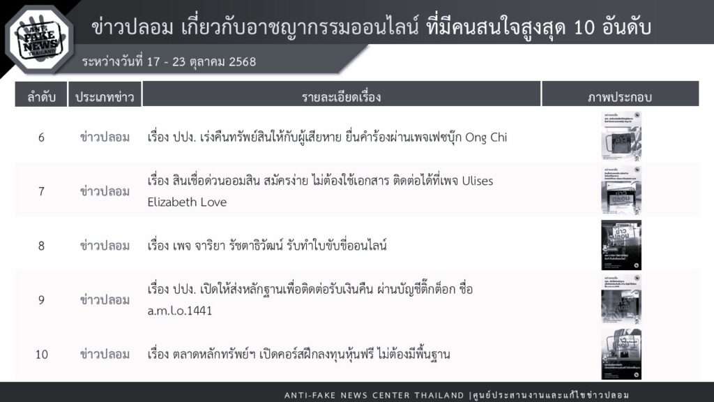 ทั้งนี้ในระหว่างวันที่ 17 – 23 ตุลาคม 2568 พบข้อความที่เข้ามาทั้งหมด 1,019,009 ข้อความ โดยมีข้อความที่ต้องดำเนินการตรวจสอบ (Verify) ทั้งสิ้น 755 ข้อความ เป็นข่าวปลอมเกี่ยวกับอาชญากรรมออนไลน์ที่ได้รับความสนใจจากประชาชนมากที่สุด 10 อันดับ ได้แก่ อันดับที่ 1 : เรื่อง กรุงไทย ส่ง SMS แนบลิงก์ ให้กรอกข้อมูลลงทะเบียนคนละครึ่งพลัสทางเว็บไซต์ อันดับที่ 2 : เรื่อง กรมวิชาการเกษตร เปิดเพจ Palm Farmer Center แจกต้นปาล์มฟรี อันดับที่ 3 : เรื่อง ฮั่วเซ่งเฮง ขายหุ้นทอง SET50 ผ่านเพจ Gold Mutual fund For Rookie อันดับที่ 4 : เรื่อง ทำใบขับขี่ออนไลน์ ไม่ต้องสอบเอง ได้ที่เพจ ทำใบขับขี่ ทุกชนิด อันดับที่ 5 : เรื่อง ฮั่วเซ่งเฮง เปิดให้ลงทุนผ่านไลน์ hsh_online69 มี ก.ล.ต. รับรองความปลอดภัย