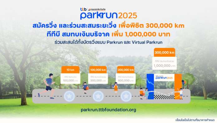 อย่ารอช้า! ทุกก้าววิ่งของทุกคนมีความหมายในงาน “ทีทีบี | ธนชาตประกันภัย พาร์ครัน 2025” โดย ทีทีบี ร่วมกับ พันธมิตรหลัก ธนชาตประกันภัย ชวนคนไทยร่วมกันวิ่งสู่เส้นชัยแห่งการให้…ไม่มีสิ้นสุด พร้อมพิชิตภารกิจพิเศษ! ร่วมกันวิ่งสะสมระยะทาง ในสถานที่และเวลาที่สะดวก เพื่อเปลี่ยนทุกก้าววิ่ง เป็นโอกาสให้เด็กและเยาวชนไทยมีคุณภาพชีวิตที่ดีขึ้น โดยทีทีบีร่วมจะสมทบเงินบริจาครวม 1 ล้านบาท เมื่อผลสะสมระยะทางวิ่งทั้งหมดครบ 300,000 กิโลเมตร ซึ่งนักวิ่งที่ซื้อบัตรวิ่งไปแล้ว ทั้งแบบ Parkrun และ Virtual Parkrun สามารถร่วมส่งผลสะสมระยะทางวิ่งได้บนเว็บไซต์ parkrun.ttbfoundation.org ถึงวันที่ 14 ธันวาคม 2568