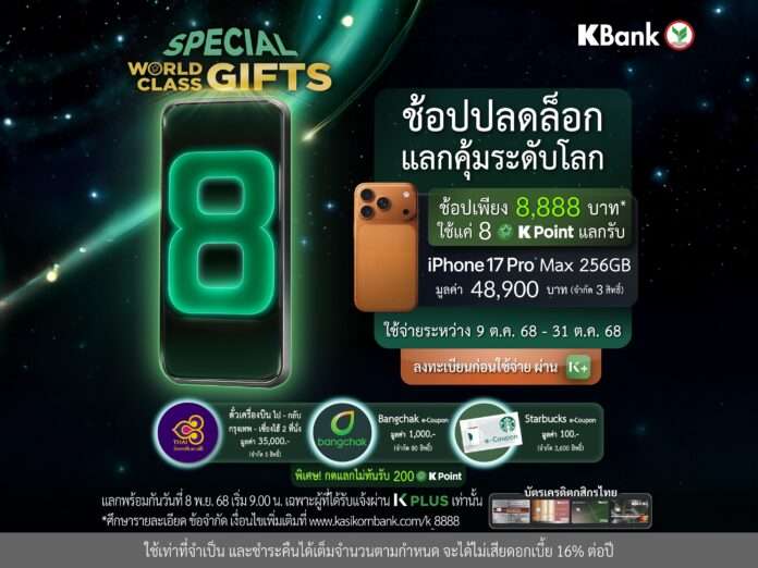 บัตรเครดิตกสิกรไทย จัดเต็มให้ลูกค้ารับความคุ้มครั้งใหม่กับแคมเปญ Special WORLD CLASS GIFTS: ช้อปปลดล็อก แลกคุ้มระดับโลก* จัดโปรโมชั่นพิเศษ เพียงลงทะเบียนก่อนใช้จ่ายผ่าน K PLUS และใช้จ่ายสะสมผ่านบัตรเครดิตกสิกรไทย ครบ 8,888 บาท* ในหมวดสินค้าที่ร่วมรายการ ระหว่างวันที่ 9 ตุลาคม 2568 – 31 ตุลาคม 2568 รับสิทธิ์ใช้ K Point แค่ 8 คะแนน แลกรับสินค้าแบรนด์ดัง