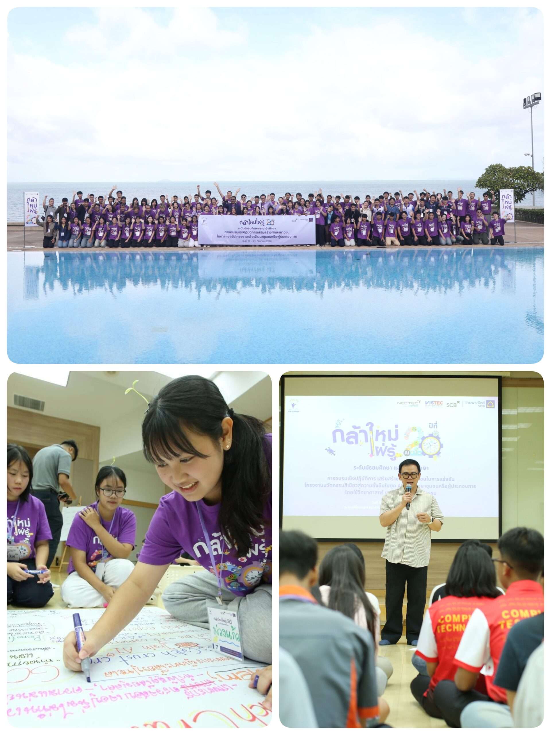 กลุ่มเอสซีบีเอกซ์ โดยธนาคารไทยพาณิชย์ จำกัด (มหาชน) จัดค่ายอบรมเชิงปฏิบัติการเตรียมความพร้อมและดึงศักยภาพให้เยาวชนสายวิทยาศาสตร์ระดับมัธยมศึกษาและอาชีวศึกษา ในการจัดทำโครงงาน “นวัตกรรมสีเขียวสู่ความยั่งยืนในยุค AI” ภายใต้โครงการ “กล้าใหม่…ใฝ่รู้” ปีที่ 20 เพื่อนำไปพัฒนาชุมชนหรือสถานประกอบการ โดยใช้วิทยาศาสตร์ เทคโนโลยี และนวัตกรรม โดยมี นายศักดิ์สิทธิ์ ปิติพงศ์สุนทร ผู้อำนวยการอาวุโส ผู้บริหารสายงานกิจกรรมเพื่อสังคม ธนาคารไทยพาณิชย์ ดร.กัลยา อุดมวิทิต รองผู้อำนวยการ สำนักงานพัฒนาวิทยาศาสตร์และเทคโนโลยีแห่งชาติ (สวทช.) ศ.ดร.ปรเมษฐ์ มนูญพงศ์ ผู้อำนวยการสำนักวิชาวิทยาศาสตร์และเทคโนโลยีสารสนเทศ สถาบันวิทยสิริเมธี (VISTEC) พร้อมทีมวิทยากรจาก SCB Academy นักวิจัยจากศูนย์เทคโนโลยีอิเล็กทรอนิกส์และคอมพิวเตอร์แห่งชาติ (NECTEC) สวทช. และ VISTEC ร่วมบ่มเพาะ ดึงศักยภาพของเยาวชน เปิดประสบการณ์ให้เยาวชนเห็นถึงผลงานนวัตกรรมที่หลากหลายของนักวิจัยจาก NECTEC และ VISTEC เช่น AI Robotics, IoT และ Kidbright พร้อมแนะนำแนวทางการพัฒนานวัตกรรม รวมถึงการทำโครงงานให้ประสบความสำเร็จ สามารถตอบโจทย์ชุมชนและสถานประกอบการได้อย่างยั่งยืน ณ ศูนย์ฝึกอบรมธนาคารไทยพาณิชย์ หาดตะวันรอน จ.ชลบุรี