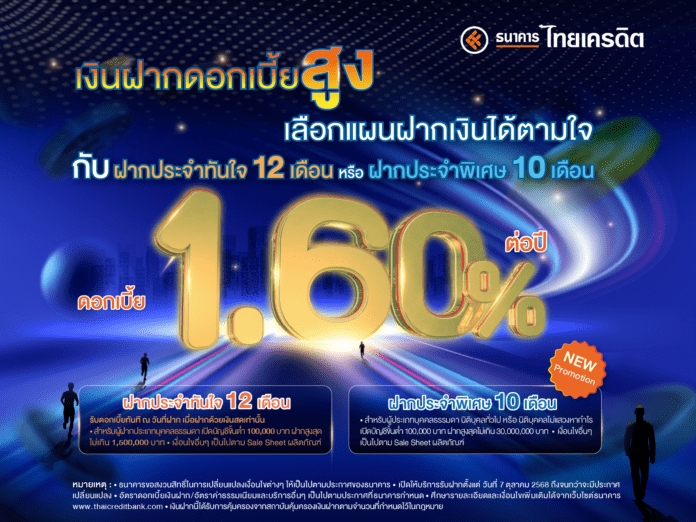 ธนาคารไทยเครดิต จำกัด (มหาชน) มอบโปรโมชันฝากประจำสุดพิเศษ รับดอกเบี้ยสูงถึง 1.60% ต่อปี ให้ผลตอบแทนที่แน่นอนและคุ้มค่า เหมาะสำหรับผู้ที่ต้องการเพิ่มผลตอบแทนจากเงินออมอย่างมั่นใจ เพียงเปิดบัญชีขั้นต่ำ 100,000 บาท