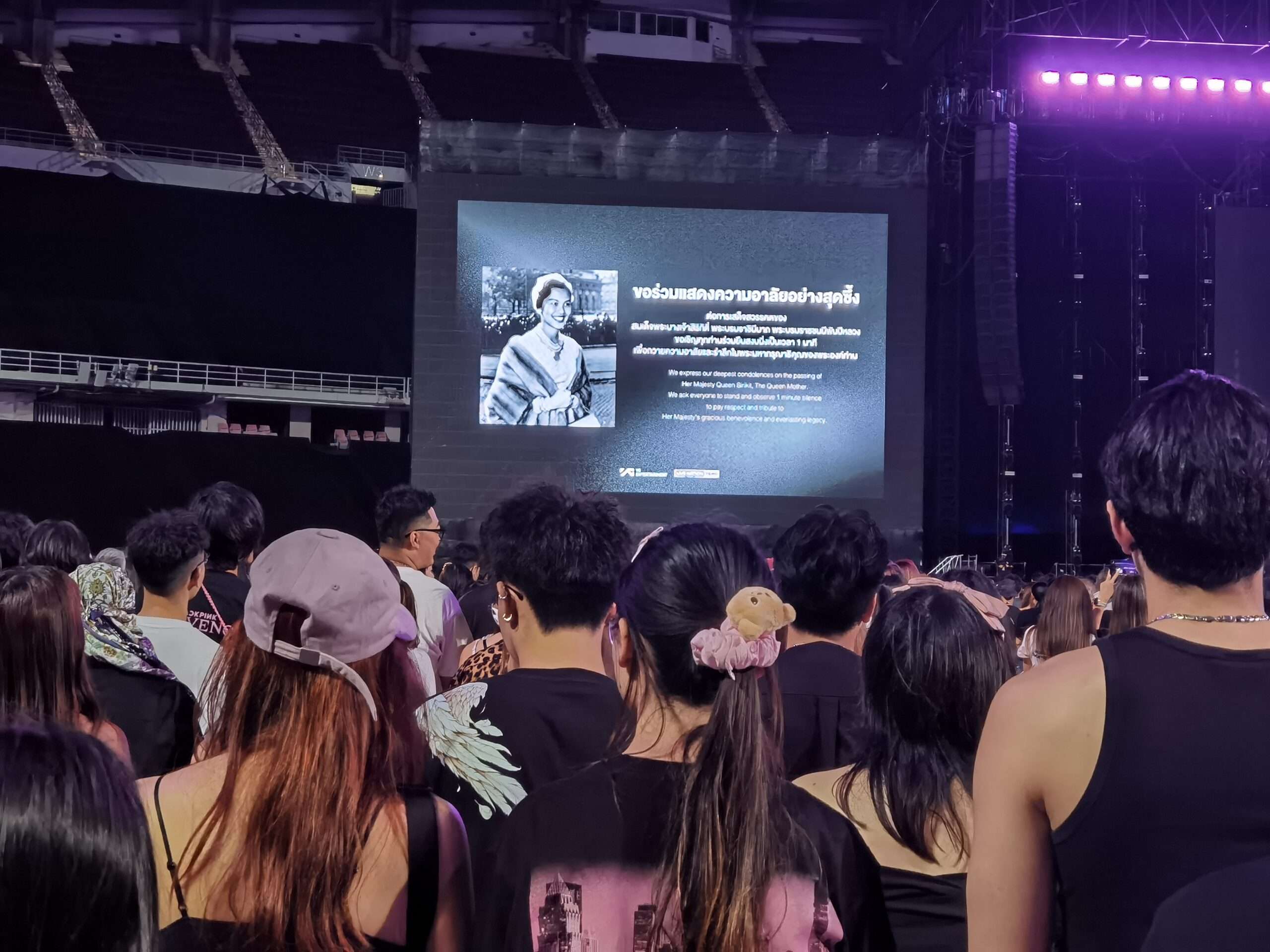 บรรยากาศคอนเสิร์ต “BLACKPINK WORLD TOUR IN BANGKOK (Deadline)” วันที่ 3 ซึ่งเป็นรอบสุดท้าย เต็มไปด้วยความสงบและความเคารพ ทางผู้จัดปรับรูปแบบการแสดงตามคำขอความร่วมมือจากรัฐบาล งดจุดพลุ ย้อมสีเอ็มวีโทนสุภาพในช่วงแรก และยืนสงบนิ่งถวายความอาลัย 1 นาที ขณะที่แฟนคลับพร้อมใจแต่งกายคุมโทนขาวดำ ร่วมแสดงความอาลัยแด่สมเด็จพระนางเจ้าสิริกิติ์ พระบรมราชินีนาถ พระบรมราชชนนีพันปีหลวง