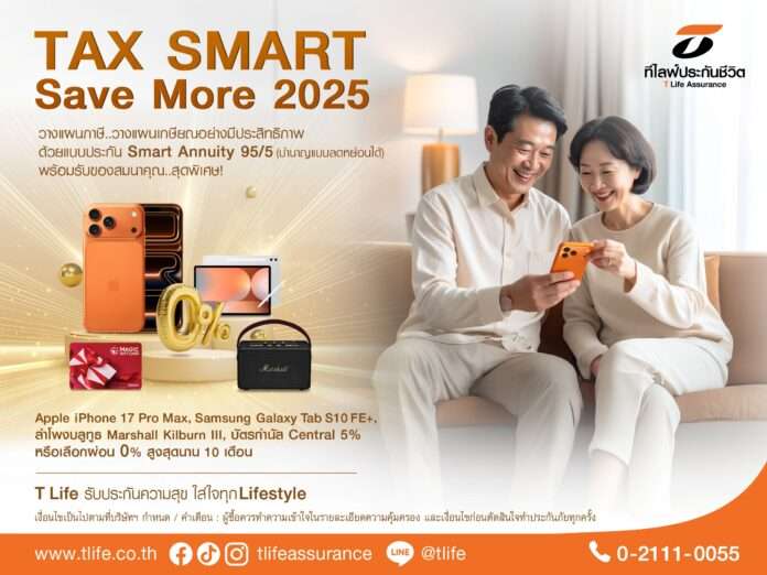ที ไลฟ์ ประกันชีวิต บริษัทในกลุ่มธนชาต ชวนคนไทยเตรียมความพร้อมสู่ชีวิตหลังเกษียณอย่างมั่นใจ พร้อมใช้สิทธิ์ลดหย่อนภาษีเงินได้บุคคลธรรมดาได้อย่างคุ้มค่าตามที่กรมสรรพากรกำหนด กับแบบประกันบำนาญ Smart Annuity 95/5 รับของสมนาคุณแบบจัดเต็ม ตั้งแต่วันนี้ – 31 ธันวาคม 2568